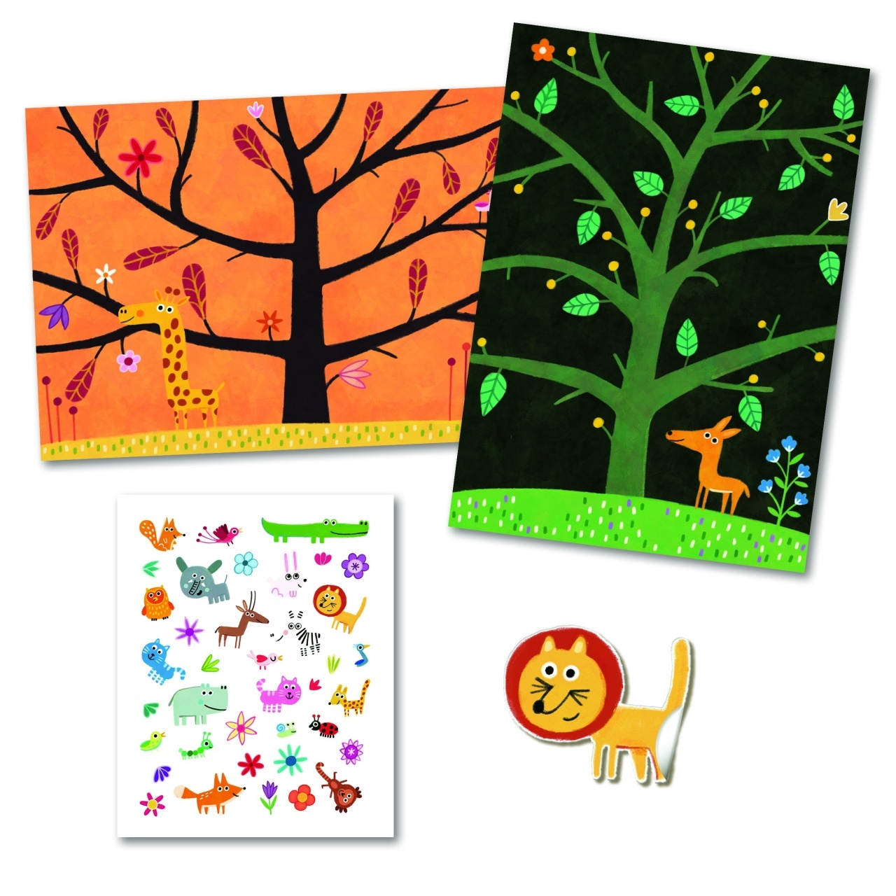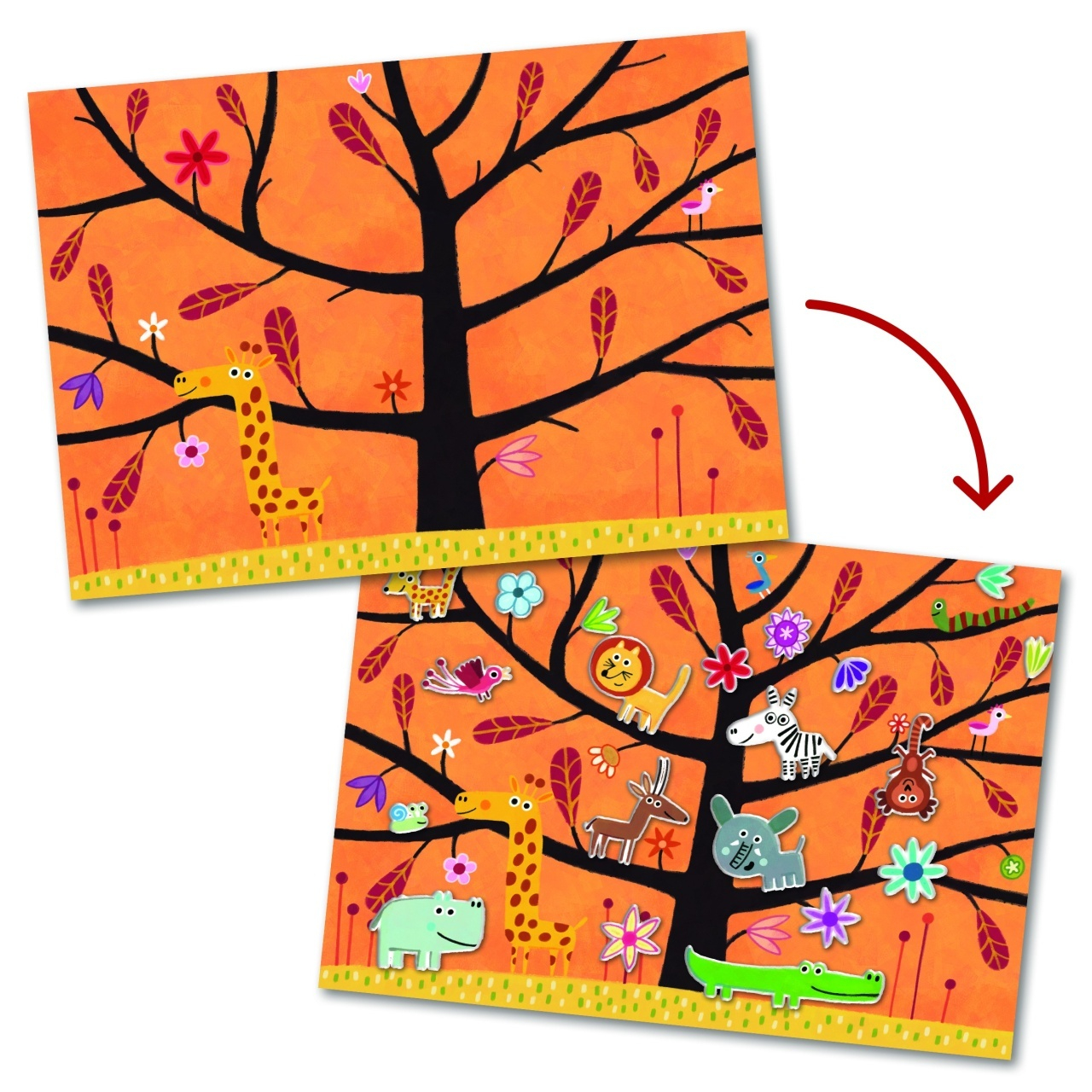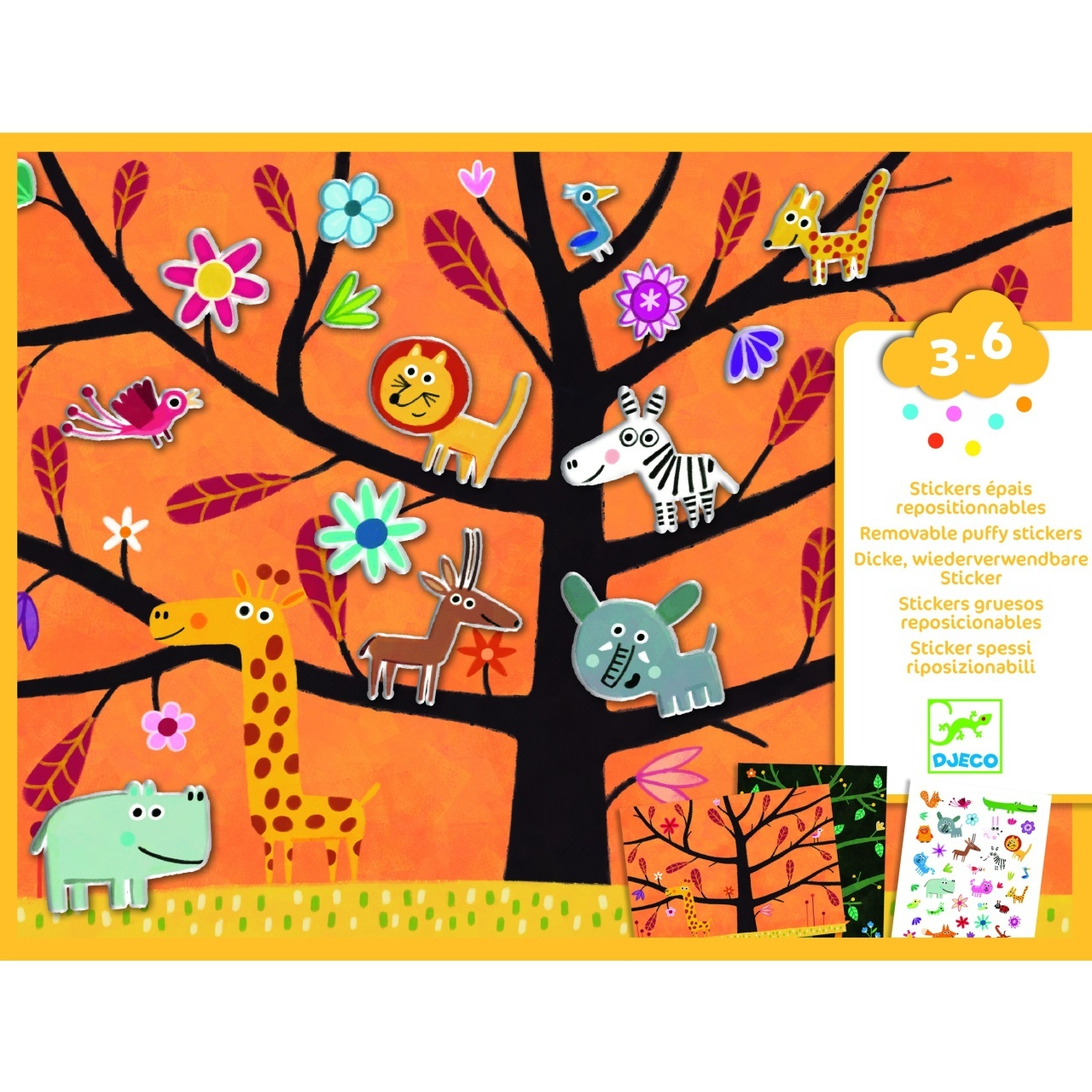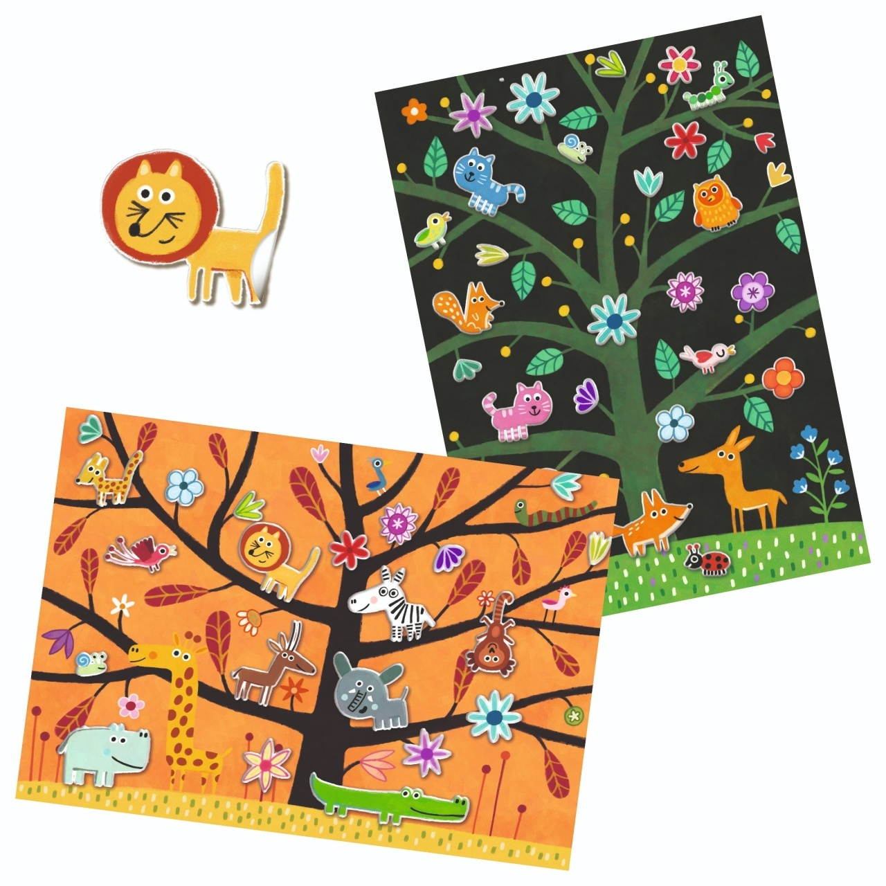 Abtibilduri repozitionabile cu animale jucauseJoaca Nu atinge pamantul! cu stickere 3D reutilizabile O activitate creativa plina de culoare si distractie! Setul contine 2 planse ilustrate de dimensiuni mari (21 x 29,5 cm), cu peisaje din savana si padure, unde animalele participa la un joc haios de Nu atinge pamantul! Cu peste 30 de stickere (3D) reutilizabile, copiii pot inventa din nou si din nou scene amuzante si pline de aventura. Varsta recomandata: 3 - 6 ani Confectionat din hartie si carton certificate FSC®. Conform reglementarilor EN71&ASTM. AVERTISMENT: Contraindicat copiilor sub 3 ani. Contine parti mici. Se recomanda supravegherea copilului de catre un adult in timpul jocului. Cititi cu atentie eticheta produsului inainte de a inmana jucaria copilului. Producator: Djeco, Franta