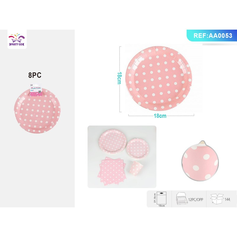 Farfurii aniversare PartyGo, 18cm, carton, buline albe, roz, AA0053, set 8 buc
