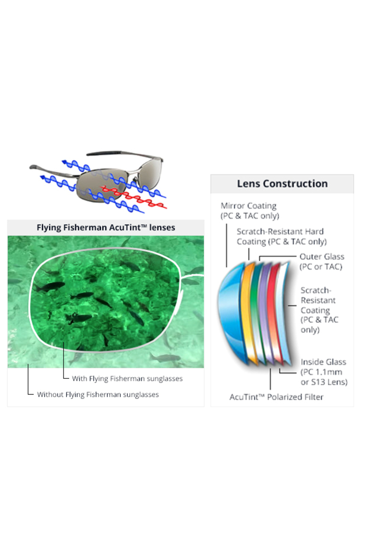 Lentilele unice ale ochelarilor Flying Fisherman elimina complet stralucirea de la suprafata apei si astfel permit ochilor sa se odihneasca chiar si in conditii de soare puternic. In plus atunci cand sunteti la pescuit puteti vedea clar ce este sub suprafata apei fapt care va ajuta atunci cand alegeti zona de pescuit si va permite sa evitati obstacolele submerse. Sistemul special de pigmentare al lentilelor AcuTint™ ofera un contrast superior culorilor si va permite sa aveti o imagine mai clara.