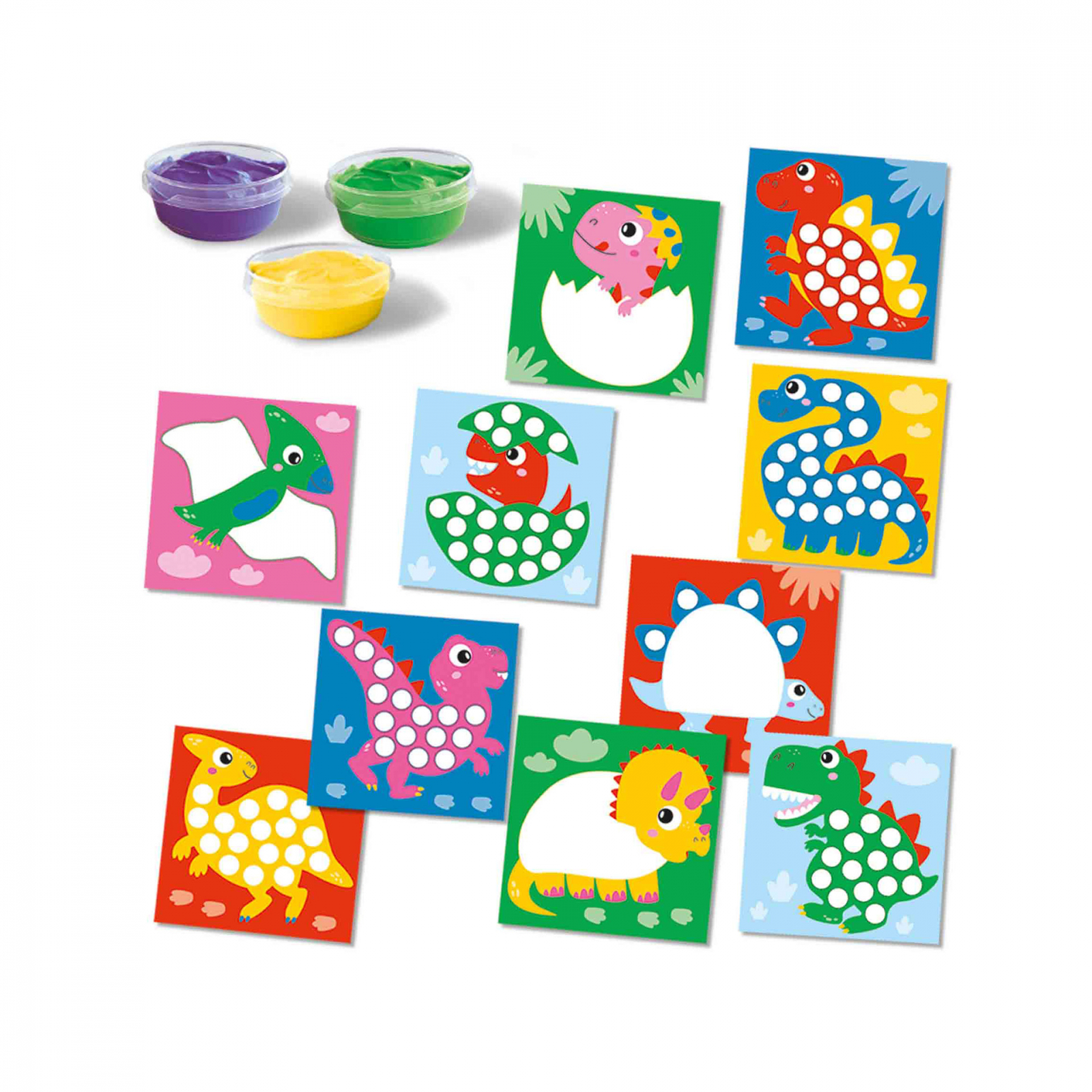 Aceste 10 carti de dino vesele ofera o experienta fericita de crafting pentru cei mici. Setul contine 10 carti de dino si 3 culori de acuarele pentru degete. Copiii pot decora diferitii dinozauri asa cum doresc, folosind degetele pentru a stampila sau a unge. O activitate distractiva pentru parintii cu copii mici. Contine: 10 planse de colorat cu animale; culoare verde pentru degete; culoare galbena pentru degete; culoare violet pentru degete. Dimensiuni: 20 x 20 x 4 cm.