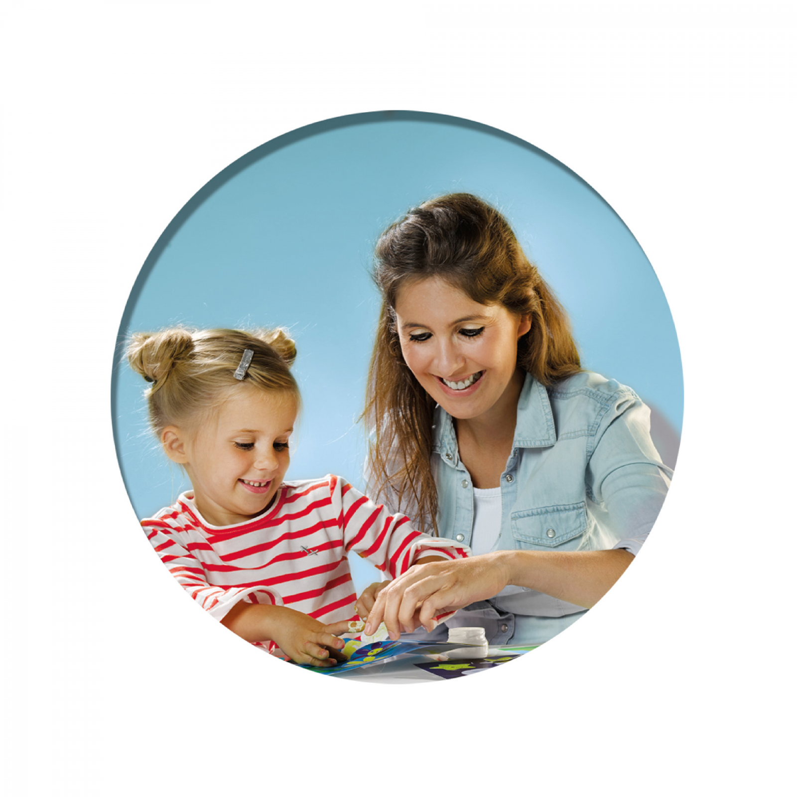Unde sunt merele? In copac! Si stelele? Pe cer! Foloseste-ti degetul pentru a puncta niste lipici pe zonele deschise ale cartilor si lipeste forma potrivita deasupra. In acest fel, poti invata sa recunosti formele intr-un mod jucaus si incepi sa-ti antrenezi si motricitatea fina. Adezivul este usor de spalat din tesaturi. Contine: 6 cartonase imprimate; forme; lipici. Dimensiuni: 20 x 20 x 4 cm.