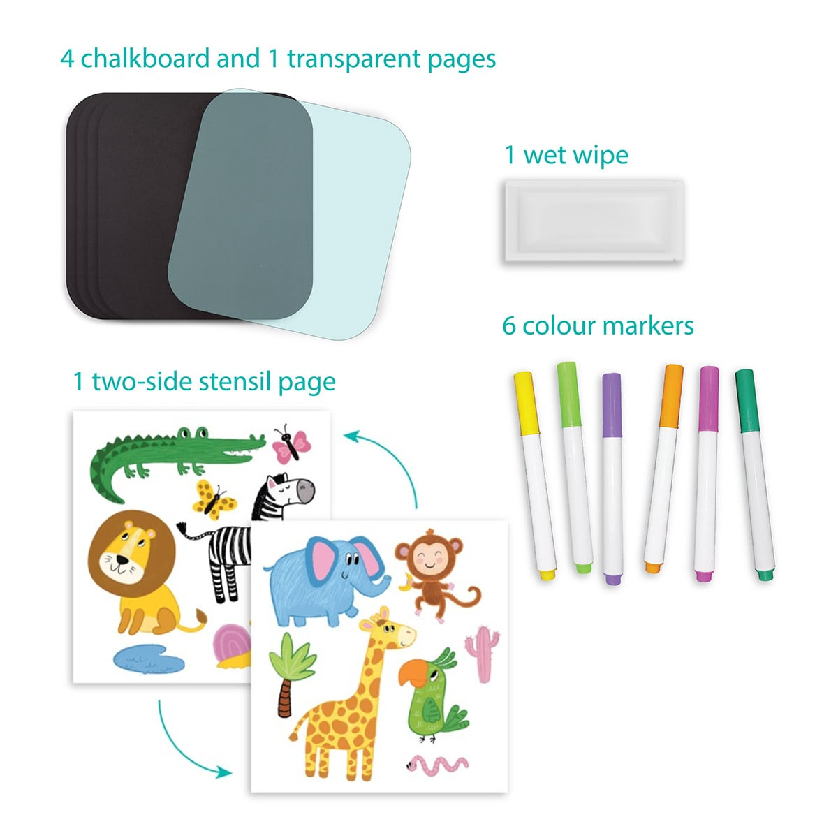 • Setul include: 4 pagini cu o suprafata care imita o tabla de scris (pentru desen cu creta sau markere speciale), 1 pagina cu sablon pentru forme si contururi, 1 pagina transparenta reutilizabila, 6 carioci lavabile colorate, 1 servetel umed pentru curatare, 1 mapa de depozitare (dimensiuni: 21 × 20 x 2 cm).