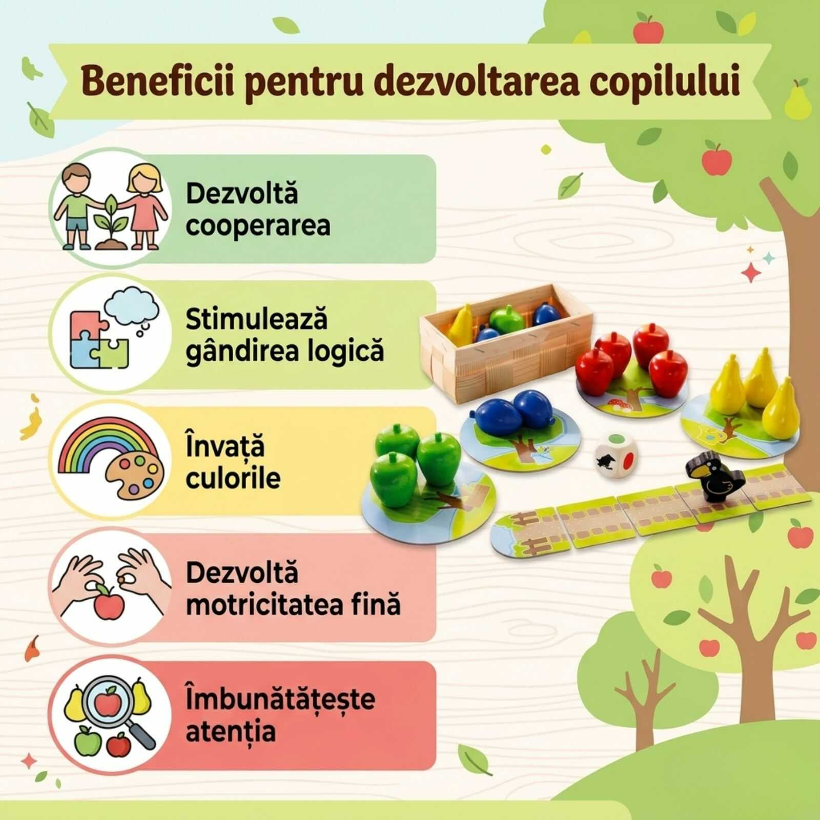 Copiii lucreaza impreuna pentru a culege fructele din livada inainte ca cioara sa ajunga la pomi, dezvoltand cooperarea, gandirea logica si recunoasterea culorilor.