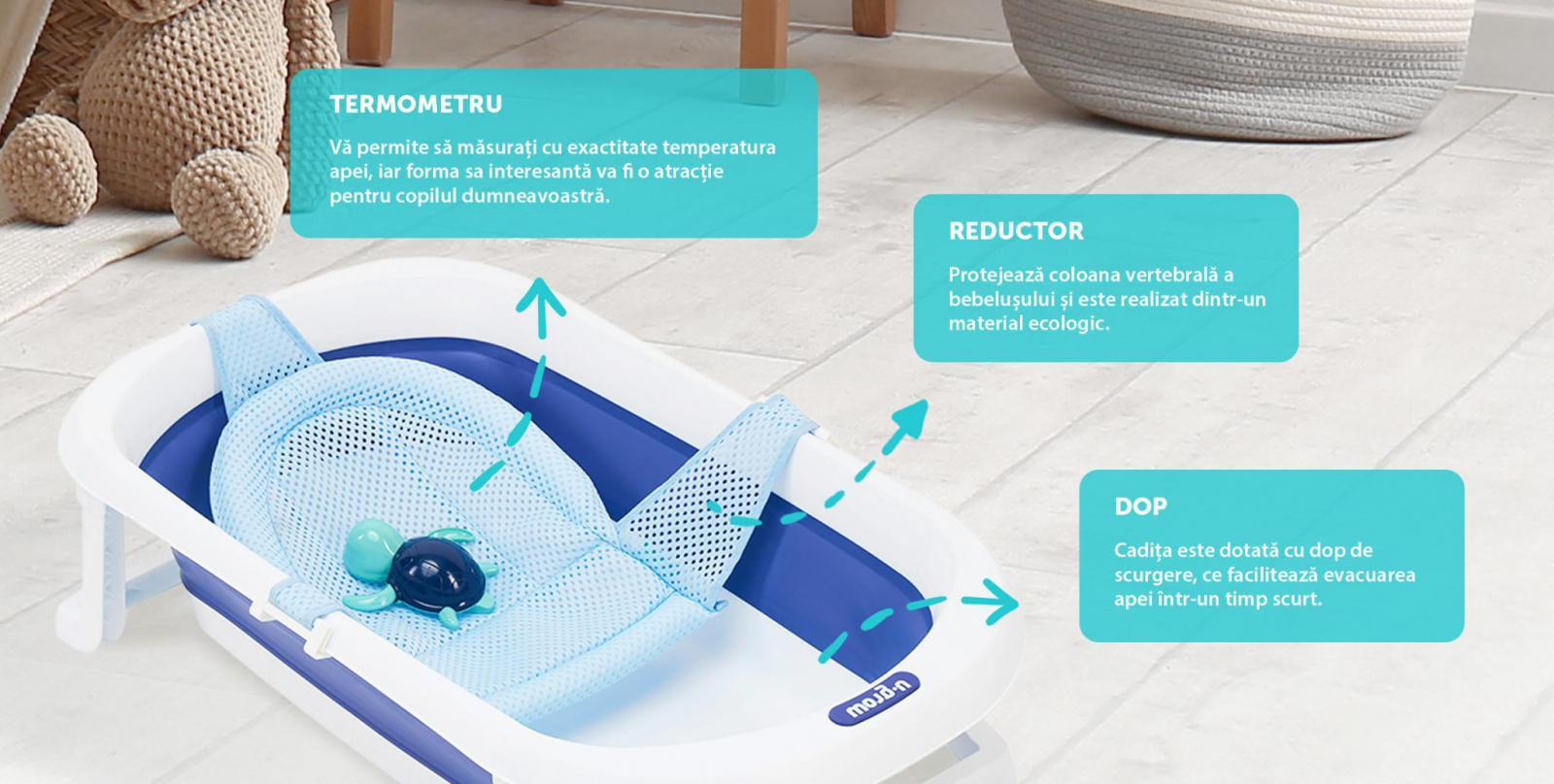 Cadita este dotata cu dop de scurgere, ce faciliteaza evacuarea apei intr-un timp scurt; Reductorul textil protejeaza coloana vertebrala a bebelusului; Constructia produsului impiedica alunecarea; Reductorul este realizat dintr-un material ecologic; Lungime reglabila; 4 elemente de prindere, pentru fixare sigura pe cadita. Termometrul inclus va permite sa masurati cu exactitate temperatura apei, Dimensiune cadita pliata: 78x25x9 cm. Dimensiune interioara cadita desfacuta: 78x25x21 cm. Produs realizat in conformitate cu standardul european: EN 17072