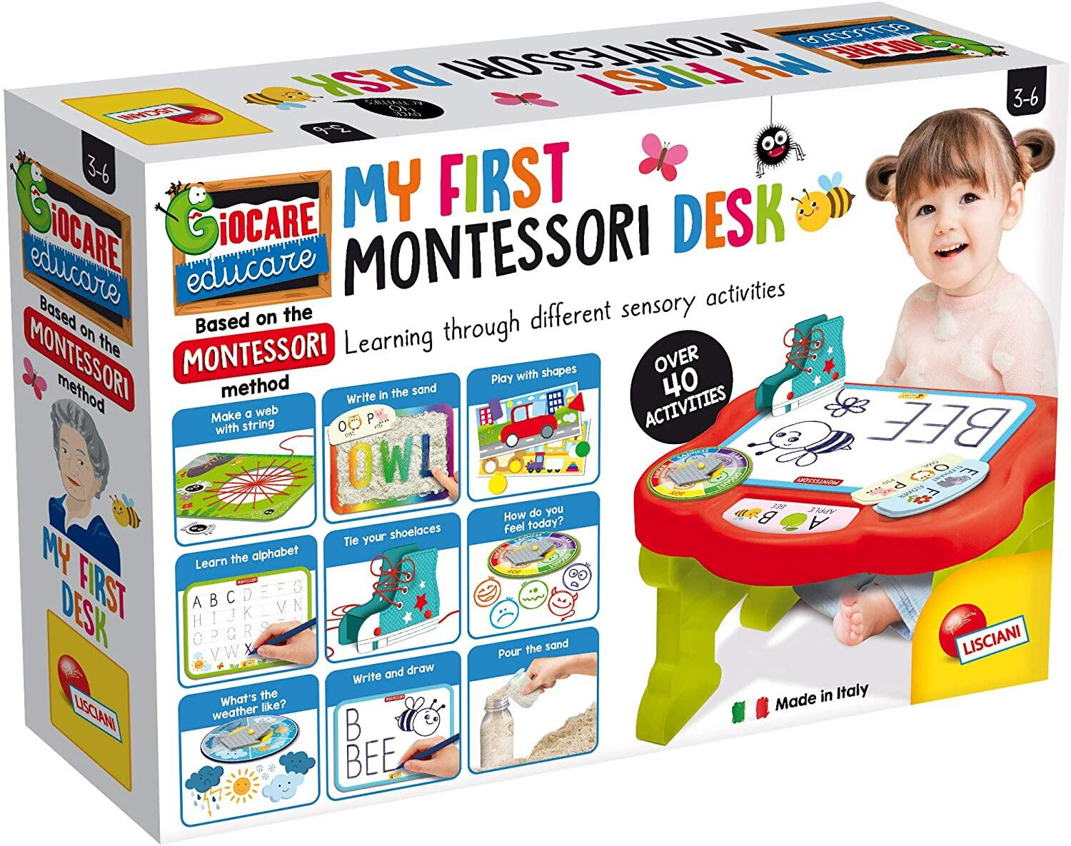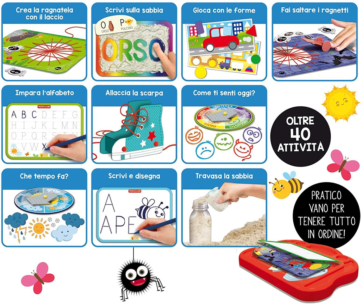 Masuta cu activitati ofera copiilor o multime de activitati bazate pe metoda de invatare Montessori. Scrie in nisip, creeaza o retea din corzi, invata sa-ti legi sireturile si multe altele!