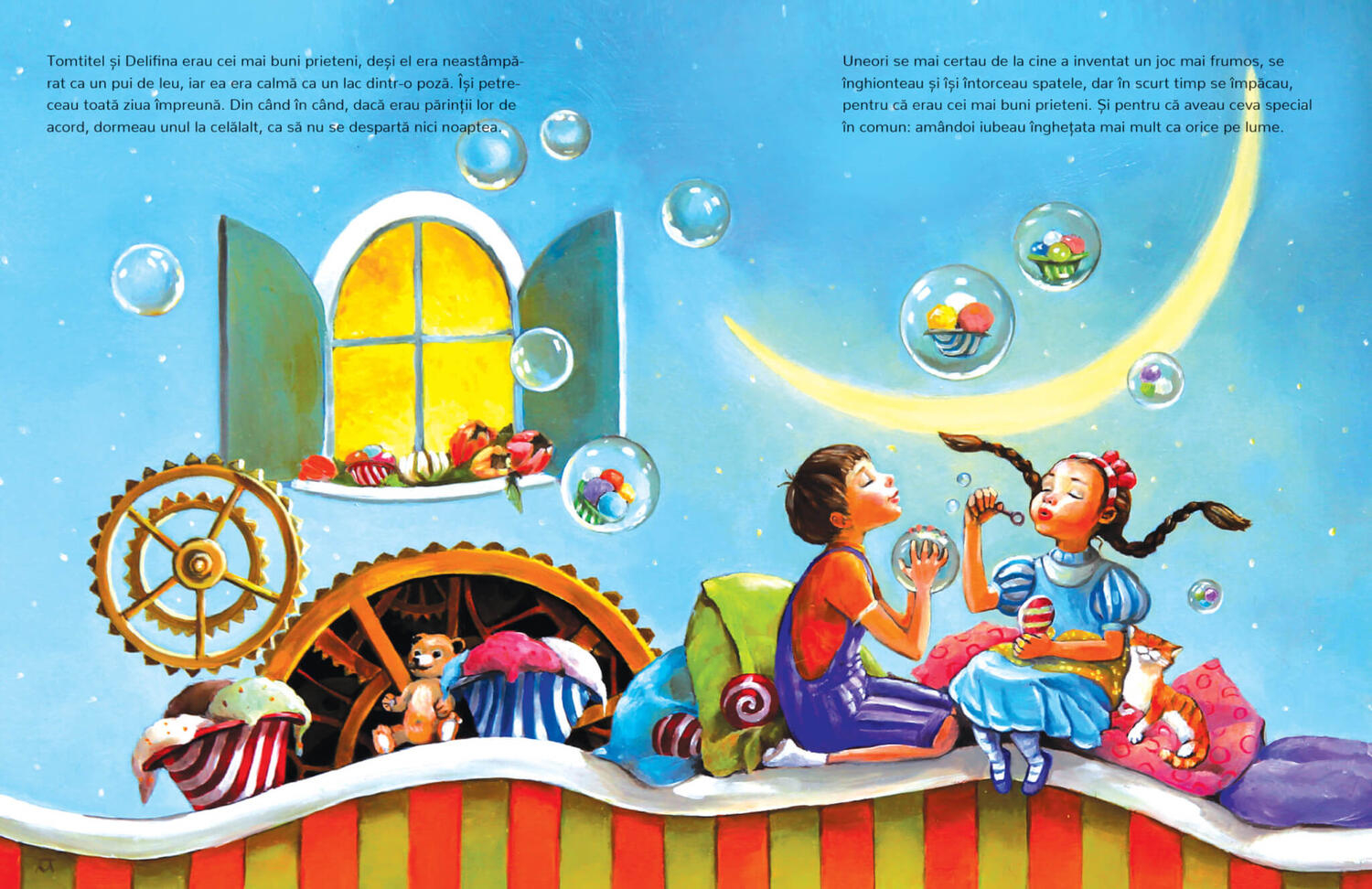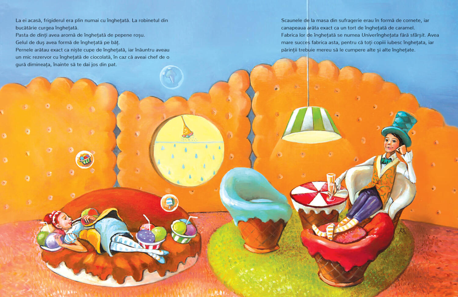 O poveste plina de culoare si surprize, scrisa cu drag de inghetata de autoarea Ioana Chicet-Macoveiciuc si ilustrata cu delicatete si magie de Mariana Kalacheva, artista internationala cu lucrari expuse in Italia, Franta, Spania, Belgia, S.U.A. (si, printr-o coincidenta, casatorita cu un domn care detine un atelier de inghetata artizanala).