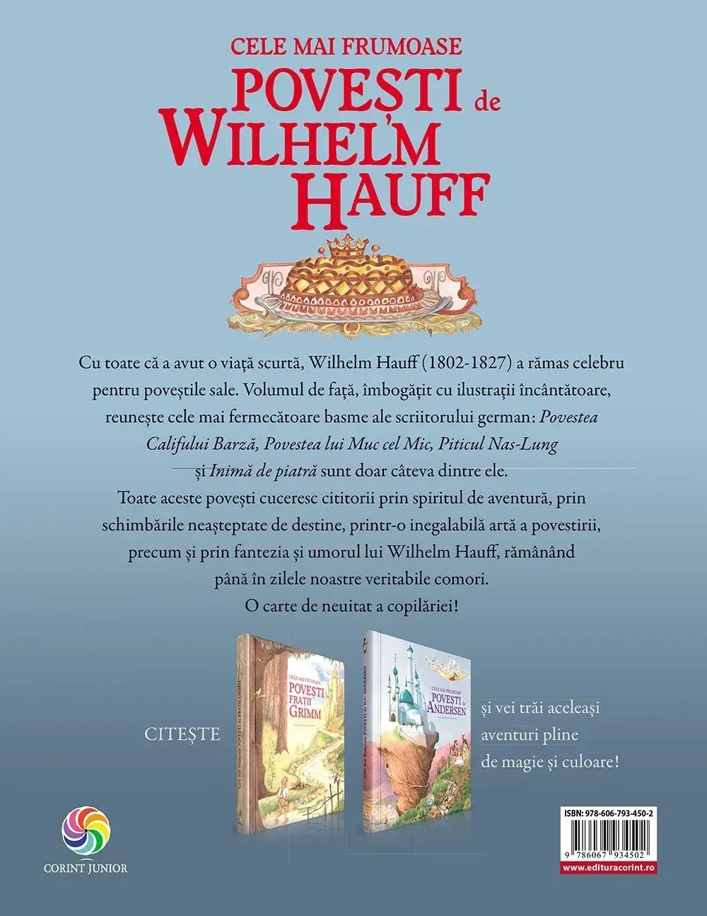 Cu toate ca a avut o viata scurta, Wilhelm Hauff (1802-1827) a ramas celebru pentru povestile sale. Volumul de fata, imbogatit cu ilustratii incantatoare, reuneste cele mai fermecatoare basme ale scriitorului german: Povestea Califului Barza, Povestea lui Muc cel Mic, Piticul Nas-Lung si Inima de piatra sunt doar cateva dintre ele. Toate aceste povesti cuceresc cititorii prin spiritul de aventura, prin schimbarile neasteptate de destine, printr-o inegalabila arta a povestirii, precum si prin fantezia si umorul lui Wilhelm Hauff , ramanand pana in zilele noastre veritabile comori.