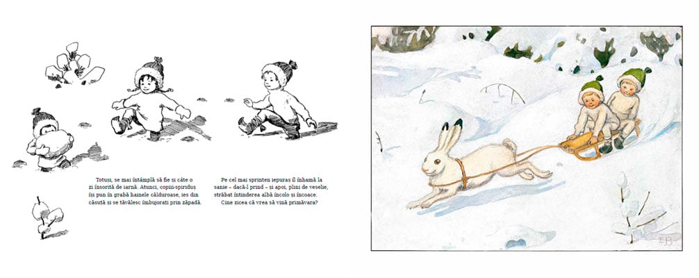 Primavara, copiii-spiridus sunt atat de bucurosi si de zburdalnici incat mamei ii este peste putinta sa-i tina acasa. Se balacesc prin paraie, construiesc baraje din bolovani sau mori de apa din bete, alearga si sar de colo-colo cat e ziulica de lunga. Chiar daca sunt uzi leoarca din cap pana-n picioare, nimeni nu-i cearta. Si nici vorba sa raceasca. Este nemaipomenit sa fii un mic spiridus!