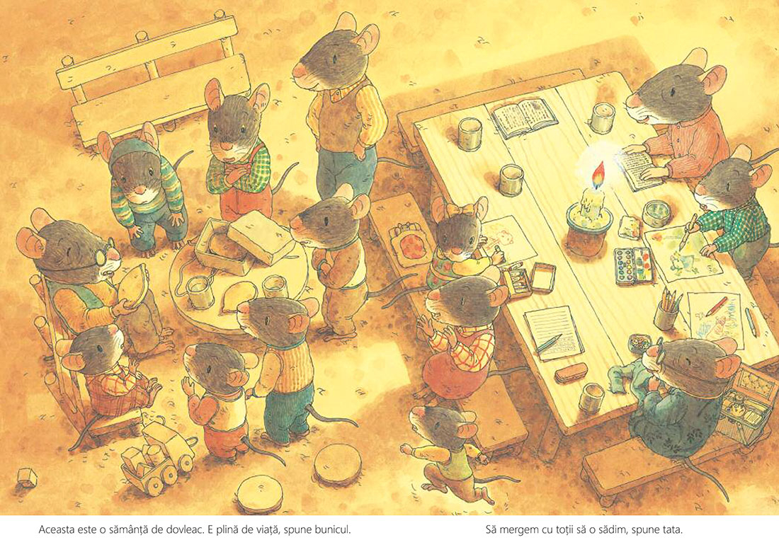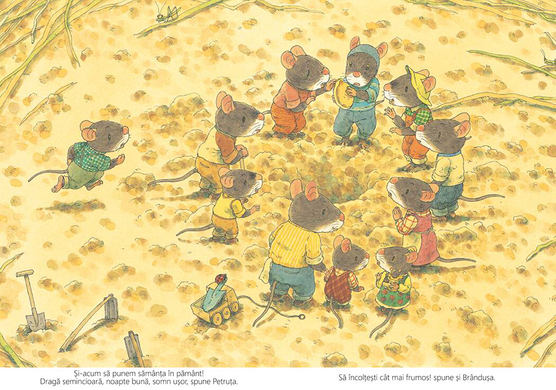 Bunica si bunicul, mama si tata stiu ca nu e nici un secret la mijloc, iar acum si copiii din familia soricel — iar împreuna cu ei, si micii cititori — vor afla ca doar prin munca, daruire si rabdare poti obtine o recolta bogata. Nici o samanta nu rodeste daca nu e sadita si îngrijita cu dragoste.
