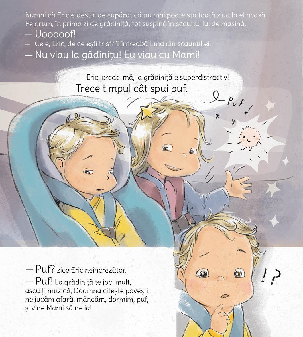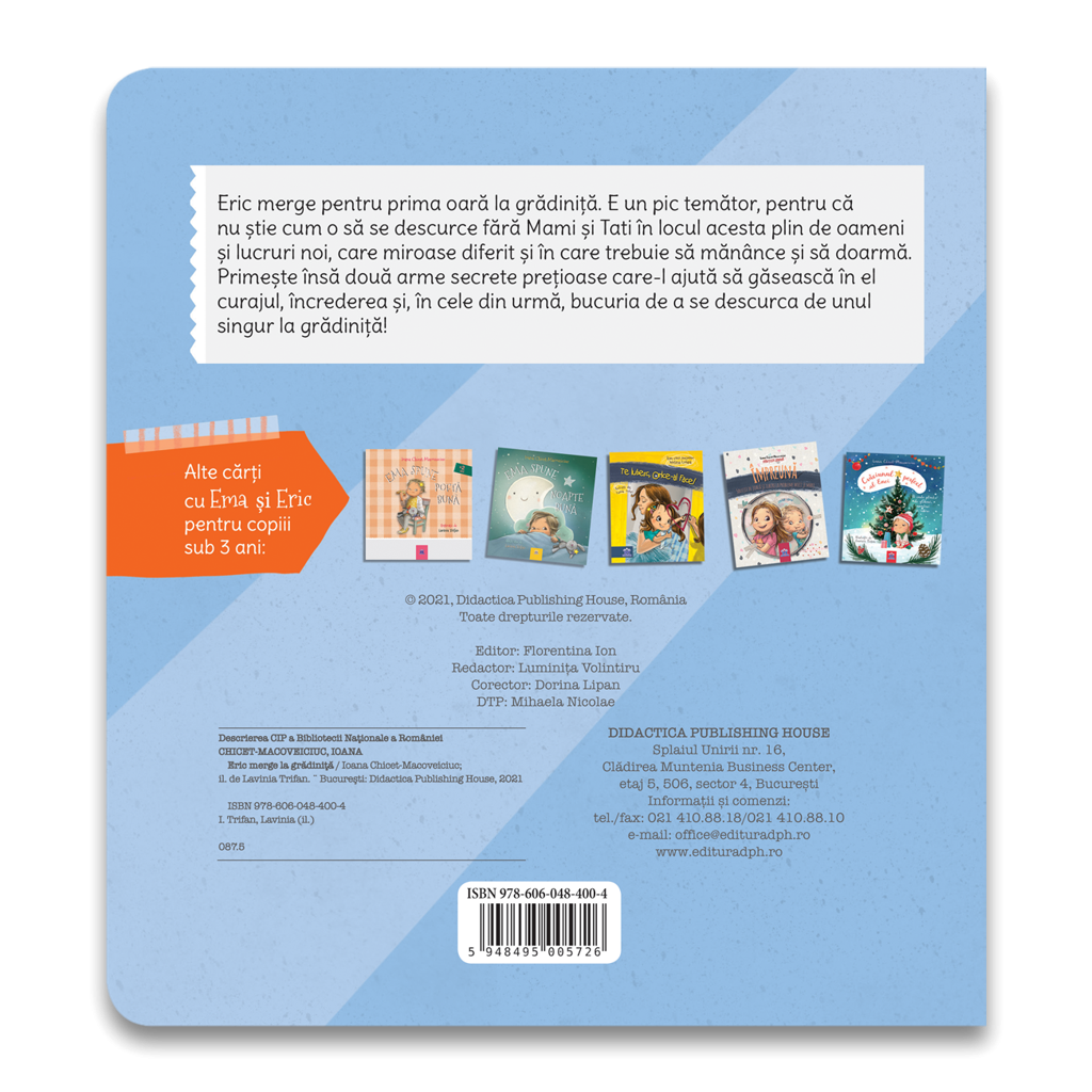Eric merge pentru prima data la gradinita si este putin temator fiindca nu stie cum se va descurca fara mami si tati. Pentru el gradinita este un loc nou, plin de oameni si lucruri noi, in care trebuie sa manance si sa doarma si care miroase diferit fata de casa lui. Dar, de curand, a primit doua arme secrete si pretioase care il ajuta sa gaseasca in el curajul, increderea si in cele din urma bucuria de a se descurca de unul singur la gradinita._x000D_ Autor: Ioana Chicet Macoveiciuc (Printesa Urbana)An aparitiei: 2021Format: 18 x 20 cmTip coperta: CartonataNumar pagini: 16ISBN: 978-606-048-400-4
