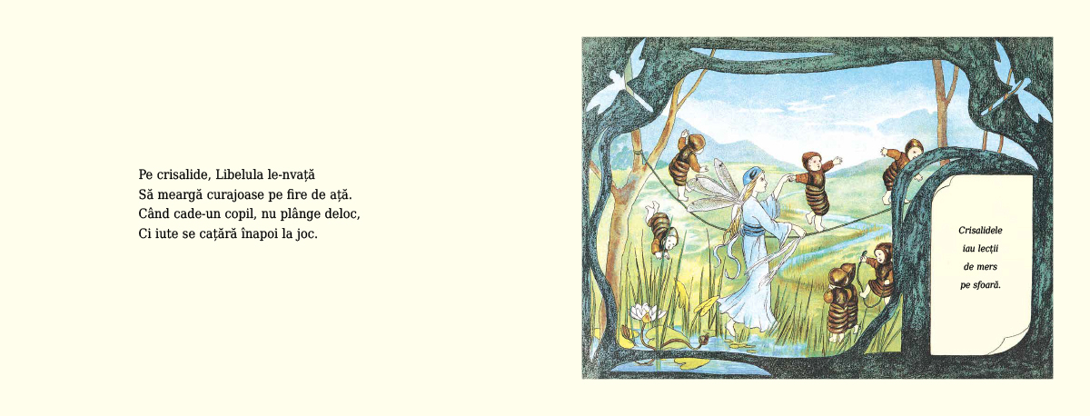 Pornind de la fluturi ca vestitori ai renasterii naturii, autoarea imagineaza o feerie de primavara, o poveste solara si calda despre viata de familie si primii pasi ai copiilor in descoperirea lumii din jur.