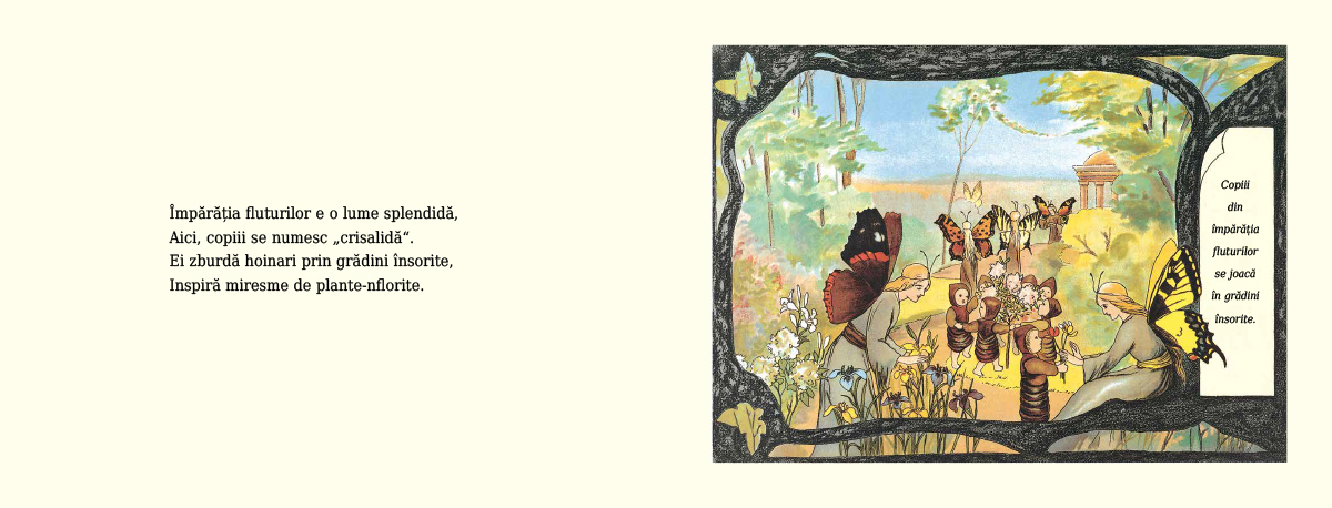 Scrisa cu naturalete si simplitate, pe intelesul copiilor mici, in catrene la care se adauga scurte note in scenele ilustrate, cartea reuseste sa descrie prin imaginara imparatie a fluturilor un ciclu etern si esential al vietii: copiii se nasc, cresc iubiti de parinti si invata tot ce le e necesar pentru a fi in stare sa-si ia singuri zborul – cu aripile care le sunt daruite chiar de maretul Soare.