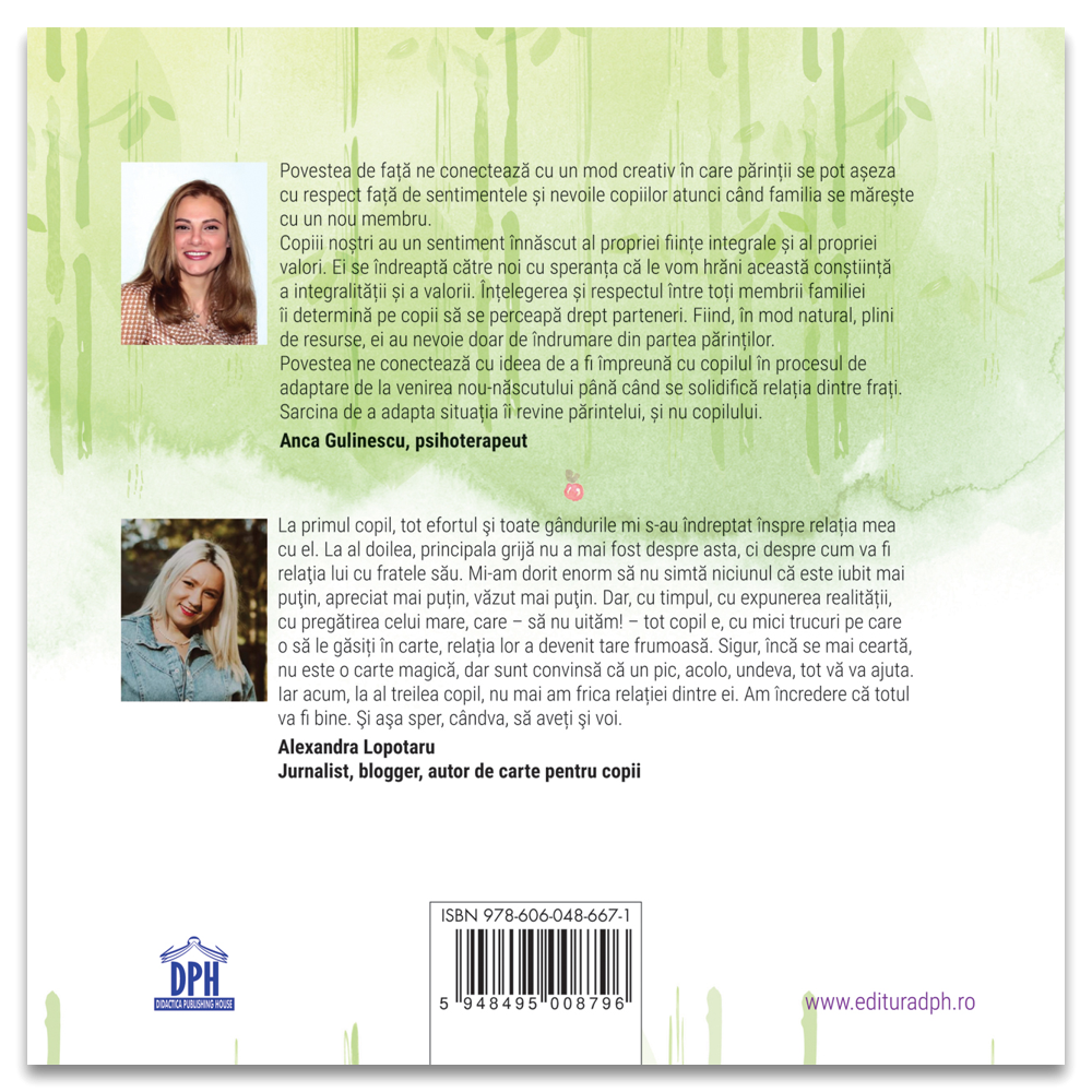 Povestea de fata ne conecteaza cu un mod creativ in care parintii se pot aseza cu respect fata de sentimentele si nevoile copiilor atunci cand familia se mareste cu un nou membru._x000D_ Copiii au un sentiment innascut al propriei fiinte integrale si al propriei valori. Ei se indreapta catre noi cu speranta ca le vom hrani aceasta constiinta a integralitatii si a valorii. Intelegerea si respectul intre toti membrii familiei ii determina pe copii sa se perceapa drept parteneri. Fiind, in mod natural, plini de resurse, ei au nevoie doar de indrumare din partea parintilor._x000D_ Povestea ne conecteaza cu ideea de a fi impreuna cu copilul in procesul de adaptare de la venirea nou-nascutului pana cand se solidifica relatia dintre frati. Sarcina de a adapta situatia ii revine parintelui, si nu copilului_x000D_ Varsta recomandata: 3 ani+_x000D_ Editura: DPH_x000D_ Autor: Alexandra LopotaruAn aparitiei: 2024Format: 21.5 x 21.5 cmTip coperta: CartonataNumar pagini: 24ISBN: 978-606-048-667-1