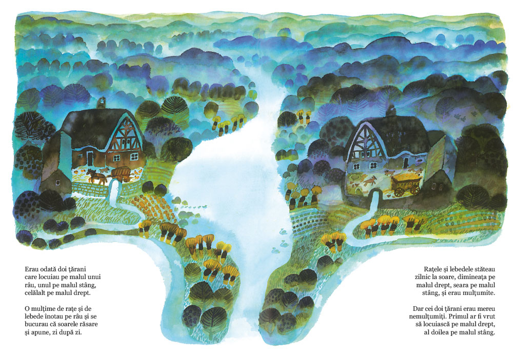 Dar cum sa te invrajbesti cu vecinul tau doar pentru ca soarele bate dimineata intr-o parte, iar dupa-amiaza in cealalta, asa cum face de cand e lumea? Ei bine, aceasta e intrebarea la care povestea, sub masca unei snoave populare, ne invita sa gasim raspunsul alaturi de doi copii, baietelul de pe malul stang si fetita de pe malul drept.