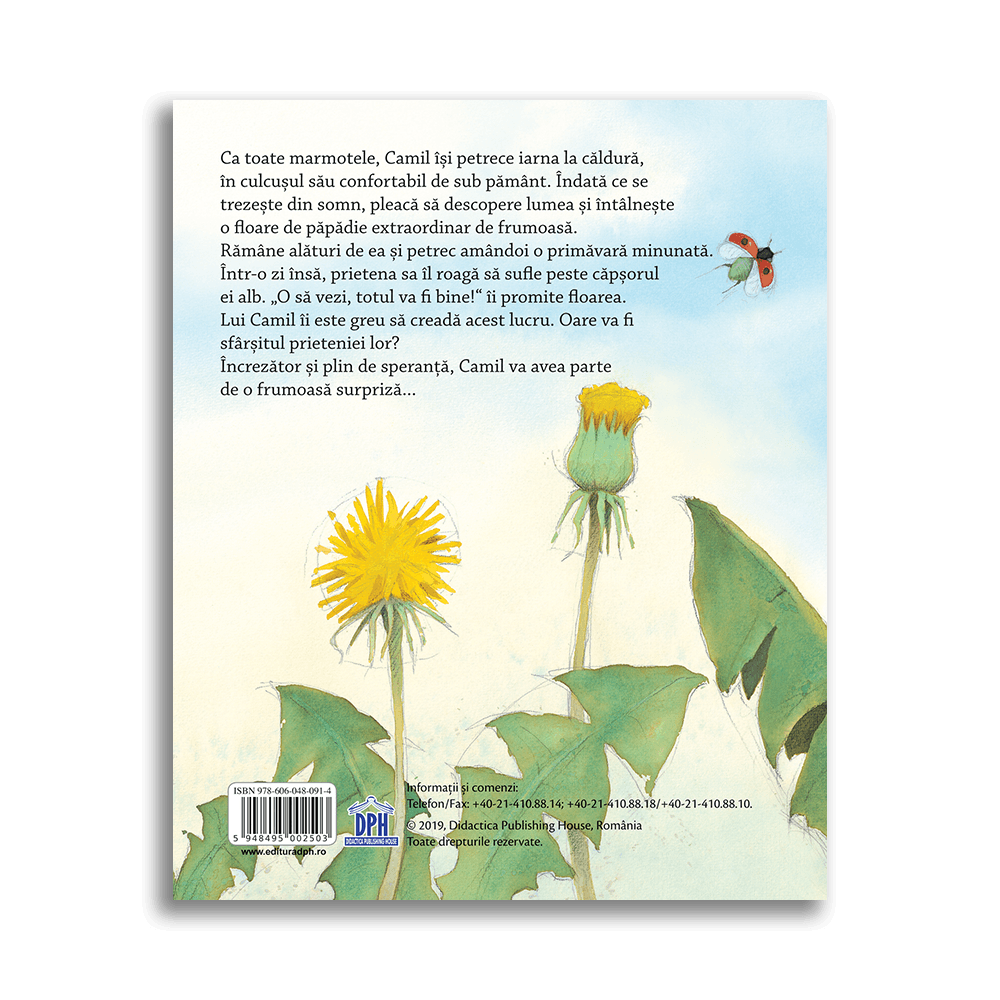 Ca toate marmotele, Camil isi petrecele iarna la caldura, in culcusul sau confortabil de sub pamant. Indata ce se trezeste din somn, pleaca sa descopere lumea si intalneste o floare de papadie extraordinar de frumoasa. Ramane alaturi de ea si petrec amandoi o primavara minunata. Intr-o zi insa, prietena sa il roaga sa sufle peste capsorul ei alb. „O sa vezi, totul va fi bine!” ii promite floarea. Lui Camil ii este greu sa creada acest lucru. Oare va fi sfarsitul prieteniei lor? Increzator si plin de speranta, Camil va avea parte de o frumoasa surpriza._x000D_ _x000D_ Varsta recomandata: 3 ani+_x000D_ Editura: DPH_x000D_ Autor: Knister, Eve TharletAn aparitiei: 2020Format: 29.5 x 24 cmTip coperta: BrosataNumar pagini: 36ISBN: 978-606-048-091-4_x000D_ Traducator: Luminita Volintiru_x000D_ _x000D_ Produsul este nou si comercializat in ambalajul original al producatorului. Imaginile de pe EduClass au caracter informativ. Nuanta, tonul si intensitatea culorii pot varia in functie de monitor.