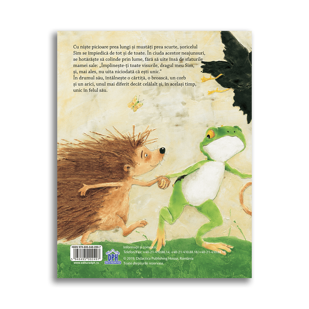 Cu niste picioare prea lungi si mustati prea scurte, soricelul Sim se impiedica de tot si de toate. In ciuda acestor neajunsuri, se hotaraste sa colinde prin lume, fara sa uite insa de sfaturile mamei sale: ""Implineste-ti toate visurile, dragul meu Sim, si, mai ales, nu uita niciodata ca esti unic."" In drumul sau, intalneste o cartita, o broasca, un corb si un arici, unul mai diferit decat celalalt si, in acelasi timp, unic in felul sau._x000D_ _x000D_ Varsta recomandata: 3 ani+_x000D_ Editura: DPH_x000D_ Autor: Brigitte Weninger, Eve TharletAn aparitiei: 2020Format: 23.5 x 28.7 cmTip coperta: BrosataNumar pagini: 24ISBN: 978-606-048-090-7_x000D_ Traducator: Luminita Volintiru_x000D_ _x000D_ Produsul este nou si comercializat in ambalajul original al producatorului. Imaginile de pe EduClass au caracter informativ. Nuanta, tonul si intensitatea culorii pot varia in functie de monitor.