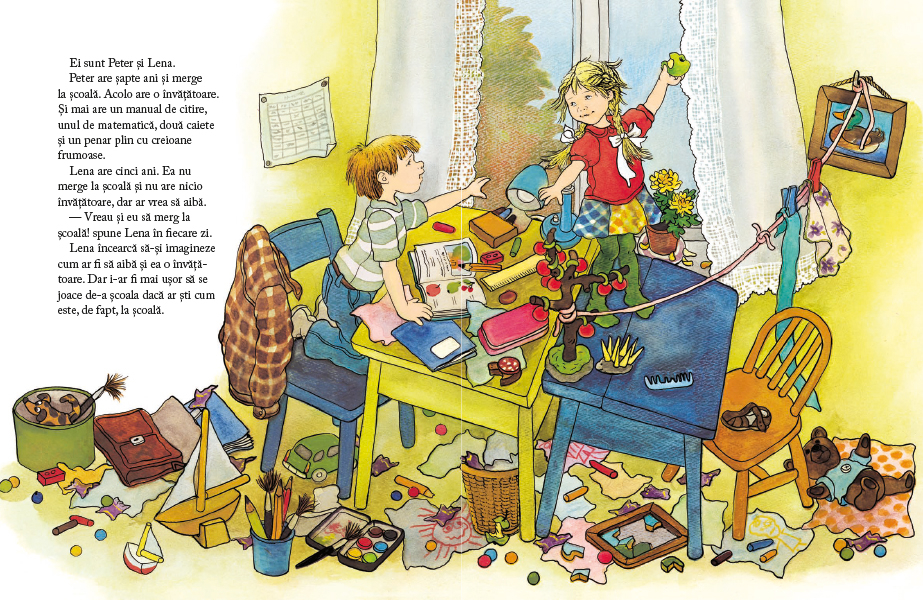Peter are sapte ani si merge la scoala. Are o învatatoare, un manual de citire, unul de matematica, doua caiete si o multime de creioane cu care scrie si deseneaza. Are si o surioara, Lena, de cinci ani. „Vreau si eu sa merg la scoala!“, spune Lena în fiecare zi si, deseori, în camera pe care o împarte cu Peter, se joaca de-a scoala.