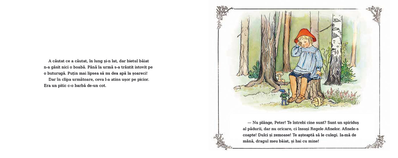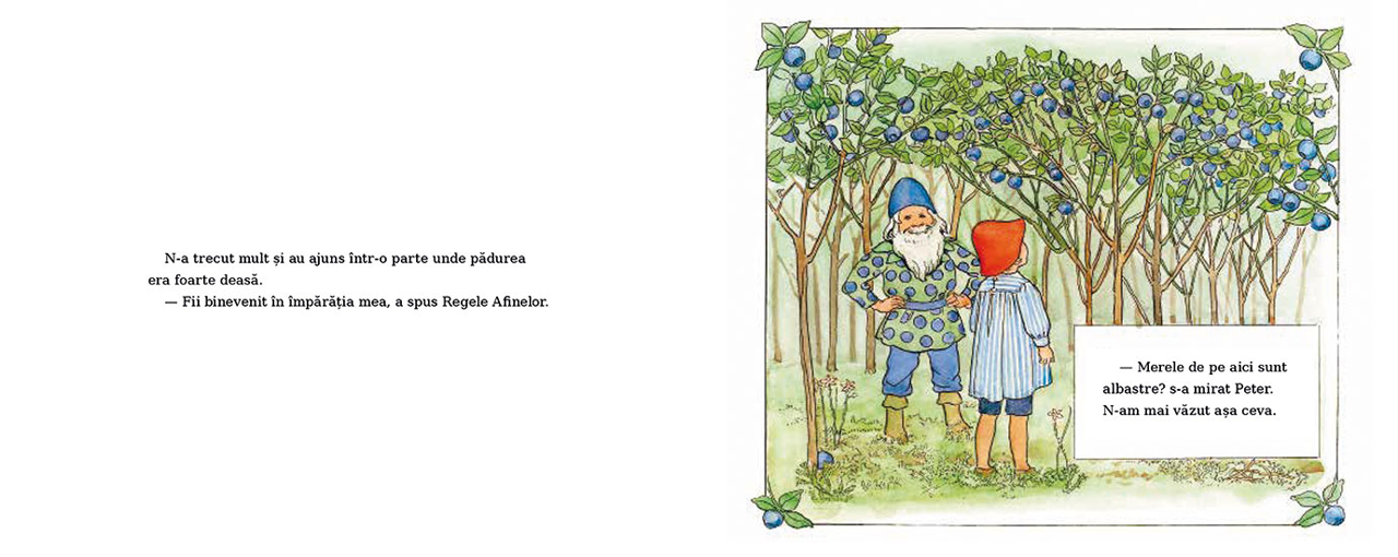 Intr-o zi, un baietel pe nume Peter a pornit la drum prin Padurea Fermecata. Avea doua cosuri in care voia sa adune afine si merisoare pe care sa i le duca in dar mamei sale de ziua ei. ""Oare am sa gasesc ceva?"" se gandea el. ""Unde s-or fi ascuns afinele si merisoarele?"" A cautat ce a cautat, in lung si-n lat, dar bietul baiat n-a gasit nici o boaba. Pana la urma s-a trantit istovit pe o buturuga. Putin mai lipsea sa nu dea apa la soareci! Dar in clipa urmatoare, ceva l-a atins usor pe picior. Era un pitic c-o barba de-un cot. — Nu plange, Peter! Te intrebi cine sunt? Sunt un spiridus al padurii, dar nu oricare, ci insusi Regele Afinelor. Afinele-s coapte! Dulci si zemoase! Te asteapta sa le culegi. Ia-ma de mana, dragul meu baiat, si hai cu mine!"