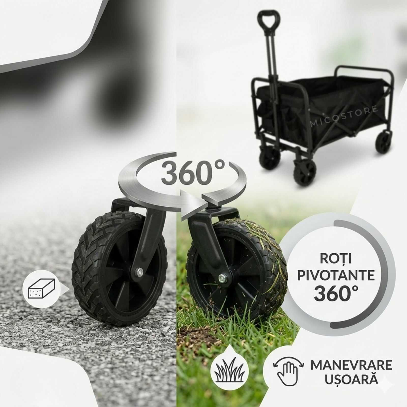 • Roti frontale pivotante 360° pentru manevrare usoara