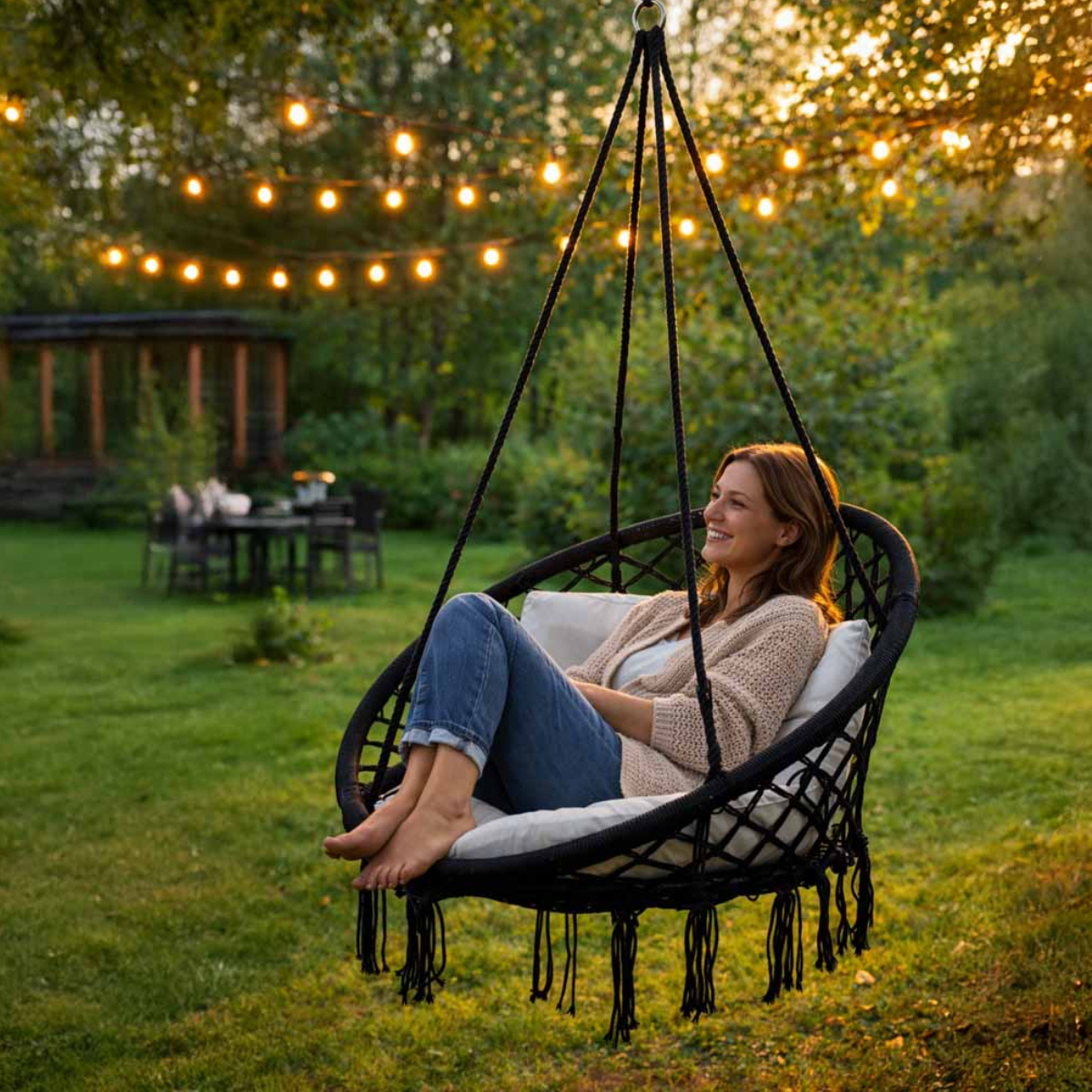 Poate fi montat oriunde doresti: in sufragerie, in dormitor sau pe terasa. Franghiile puternice, realizate printr-o tehnica speciala de impletire, impreuna cu cadrul metalic rezistent, garanteaza siguranta in timpul utilizarii si o durata lunga de viata. Acest leagan transforma orice colt al casei intr-un mic parc de distractii pentru copii si o oaza de liniste pentru adulti. Diametrul generos al sezutului si spatarul confortabil ofera o sustinere excelenta, facand din fiecare moment petrecut in hamac o adevarata placere. Savureaza un ceai cald sau citeste cartea preferata in timp ce te lasi purtat de confortul acestui scaun suspendat, realizat cu o atentie deosebita la fiecare detaliu.