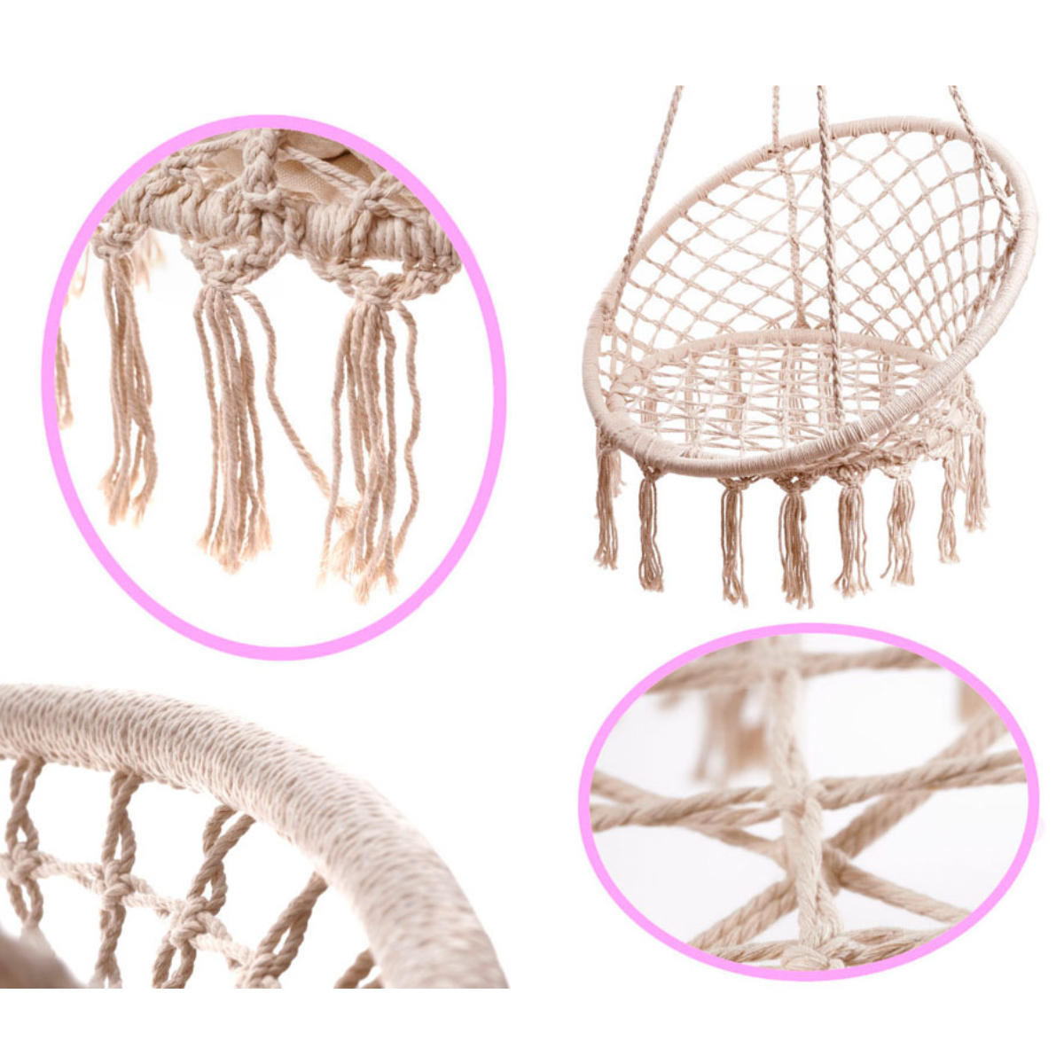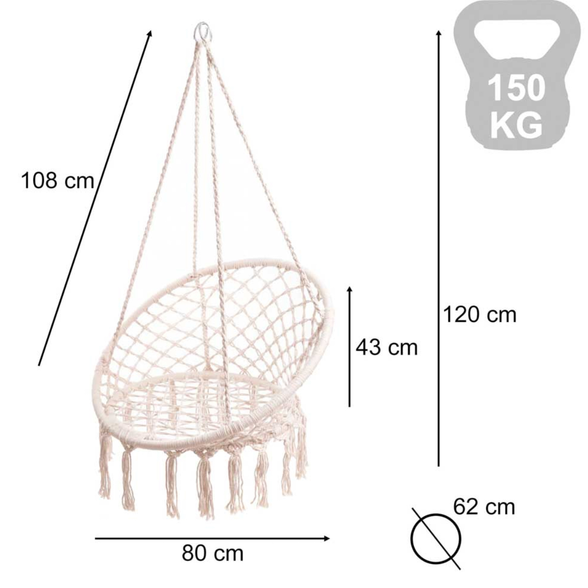 Acest leagan tip cuib de barza reprezinta solutia ideala pentru relaxare si joaca, fiind potrivit atat pentru living sau dormitor, cat si pentru gradina sau terasa. Construit pe un cadru metalic robust invelit in franghii de bumbac cu impletitura speciala, suporta o greutate de pana la 150 kg, oferind siguranta deplina pentru copii si adulti. Designul sau modern in nuanta ecru se integreaza perfect in orice decor interior sau exterior. Cu un diametru total de 80 cm si un spatar ergonomic de 45 cm, acest scaun suspendat garanteaza un confort sporit pentru citit, odihna sau activitati recreative, fiind o piesa de mobilier versatila si durabila.