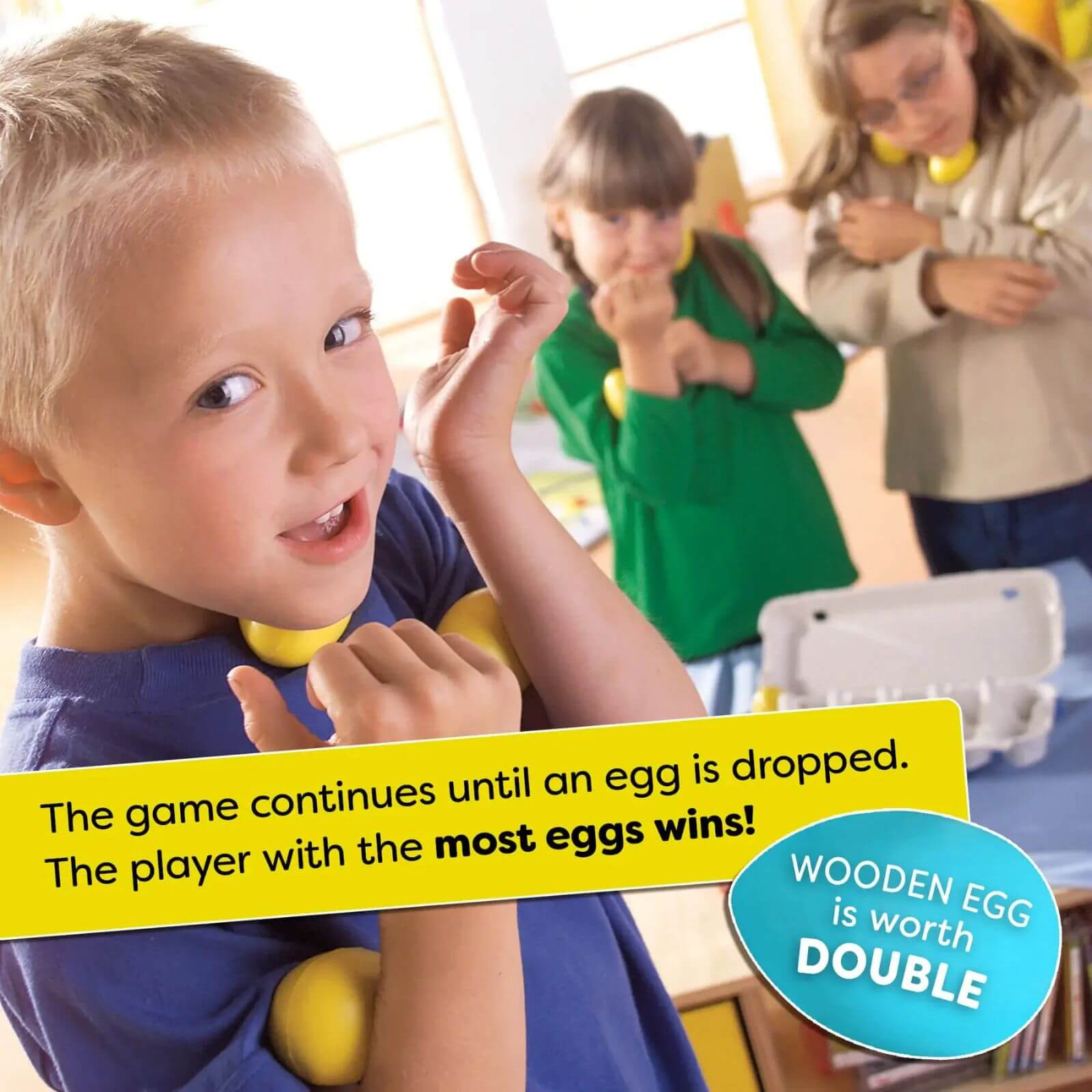 Scopul jocului este simplu: fiecare jucator trebuie sa adune cat mai multe oua si sa le tina fara sa le scape. Provocarea apare atunci cand trebuie sa le tii in diferite moduri – intre genunchi, sub barbie sau in alte pozitii neobisnuite.