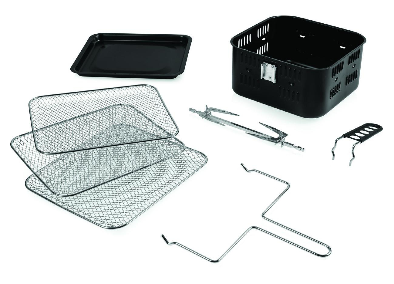 Friteuza cu aer cald Heinner HAF-B2000FB, putere: 2000W, capacitate cuptor: 11L, capacitate cos de preparare: 4.5L, panou de comanda tactil, 8 programe de preparare, temporizator: 4h, temperatura reglabila: 30- 200°C, tava pentru scurgerea uleiului, 3 rafturi pentru preparare cu aer cald, tija rotisor, maner pentru rotisor, oprire automata, picioare antialunecare