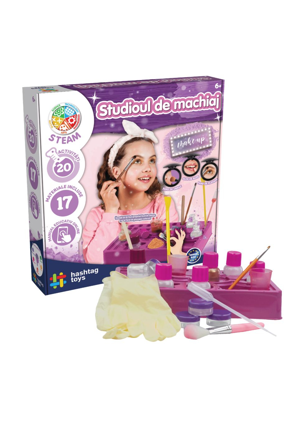 Cu acest set poti crea propriul tau studio de machiaj! Cu aceasta jucarie fantastica vei invata cum sa iti faci singura farduri de obraz, luciuri de buze si farduri de pleoape! Descopera cele 3 activitati incluse si distreaza-te personalizandu-ti propriile produse de machiaj! Continutul setului perie pentru blush, pigment auriu, agent absorbant, pigment roz, cupe mici gradate, agent de stralucire, manusi, recipiente rotunde, pipeta Pasteur, spatula din plastic, spatula din lemn, agent de legare, perie pentru fard de pleoape, agent hidratant, studio cosmetic (organizator).