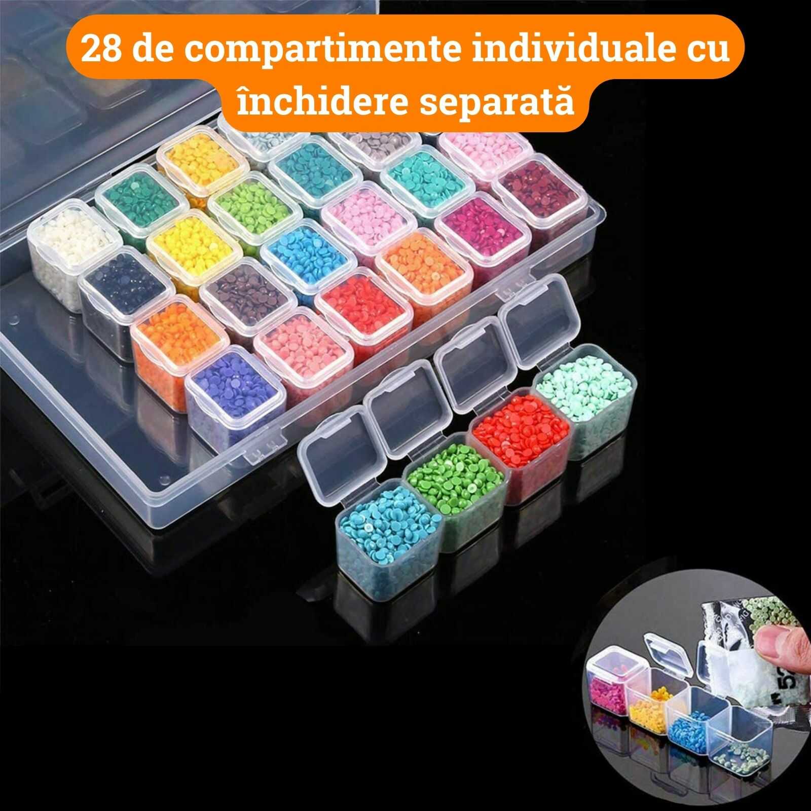 Organizatorul este prevazut cu 28 de compartimente care pot fi scoase. Fiecare compartiment are inchidere separata care asigura siguranta diamantelor depozitate. Faciliteaza organizarea si depozitarea margelelor. Utilizati cutia de depozitare cu 28 de compartimente si etichetele adezive pentru a marca si organiza diamantele dupa culoare sau numar. Aceasta asigura o gestionare eficienta a materialelor si usurinta in utilizare pentru proiecte viitoare.