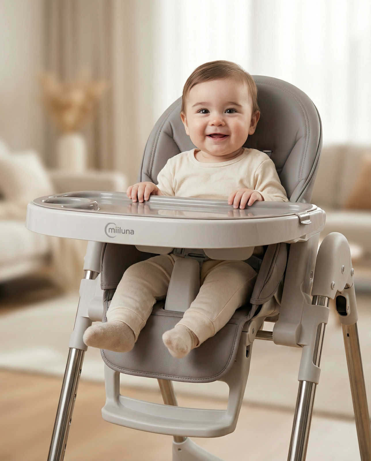 Miiluna Andromeda Grey locul sigur si confortabil unde fiecare moment devine special Imaginati-va cum micutul vostru zambeste in timp ce il asezati in scaun relaxat, confortabil, protejat. Miiluna Andromeda Grey nu este doar un scaun de masa, ci locul unde primele gusturi, primele rasete si primele descoperiri devin memorii de neuitat. Spatar reglabil pana la 145° Fie ca micutul vrea sa stea drept la masa sau sa se relaxeze dupa o gustare, spatarul reglabil ii ofera sustinere perfecta. Este ca un mic brat care il tine confortabil, protejat si fericit, fie ca se joaca sau doarme o clipa. Suport de picioare ajustabil in 3 pozitii Copiii cresc rapid, iar Miiluna Andromeda Grey creste impreuna cu el. Suportul de picioare il ajuta sa stea corect si relaxat, sprijinindu-i micile membre intr-un mod natural si ergonomic. Reglare inaltime pe 7 pozitii Indiferent daca este un mic explorator sau abia incepe sa invete sa stea la masa, scaunul se ajusteaza usor pentru a fi la inaltimea perfecta. Tu vei avea tot timpul acces la el fara sa te apleci prea mult, iar el se simte implicat si in siguranta. Husa din PU ecologic, usor de curatat Zambete, gusturi noi, pete&hellip toate fac parte din copilarie! Dar curatarea nu trebuie sa fie o povara. Materialul ecologic al husei se curata rapid si usor, pastrand scaunul proaspat si igienic pentru fiecare moment petrecut impreuna. Masa principala si tavita secundara Fiecare masa sau moment de joaca poate fi adaptat instant. Tavita secundara se inlocuieste rapid, astfel incat sa treci usor de la hranire la joc. Asa, copilul tau exploreaza, gusta si invata fara intreruperi, iar tu te bucuri de fiecare zambet. Rotite pentru transport facil Vrei sa muti scaunul din bucatarie in living sau in camera de joaca? Cu rotitele integrate, mutarea este rapida si fara efort, iar copilul ramane mereu in centrul atentiei tale. Pliabil si usor de depozitat Cand spatiul e limitat, fiecare centimetru conteaza. Miiluna Andromeda Grey se pliaza simplu si ocupa foarte putin loc, astfel incat sa ai mai mult spatiu pentru joaca, pentru tine sau pentru momentele in care vrei sa pastrezi ordinea. Culori moderne si elegante Pe langa functionalitate, scaunul aduce un strop de stil in casa ta. Culorile sale moderne se potrivesc armonios in orice interior, integrandu-se natural si aducand o nota de prospetime si veselie. Stabilitate si siguranta Cu sistemul de amortizare profesionist si centura de siguranta in 5 puncte, copilul tau este protejat in orice moment imprevizibil. Tu te bucuri linistita, iar el se simte liber sa exploreze, sa invete si sa rada. Caracteristici tehnice complete Spatar reglabil pana la 145° Suport de picioare reglabil in 3 pozitii Reglare inaltime pe 7 pozitii Husa din PU ecologic, usor de curatat Masa principala si tavita secundara, cu inlocuire rapida Rotite pentru transport facil Pliabil si usor de depozitat Centura de siguranta in 5 puncte Sistem profesionist de amortizare pentru stabilitate Culori moderne si elegante, adaptabile oricarui interior Versatil se poate folosi ca scaun de masa, fotoliu, scaun de joaca sau masa de activitati Dimensiuni Depliat 82 cm (L) x 57cm (A) x 105 cm (I) Ambalat 82 cm (L) x 57cm (A) x 105 cm (I)