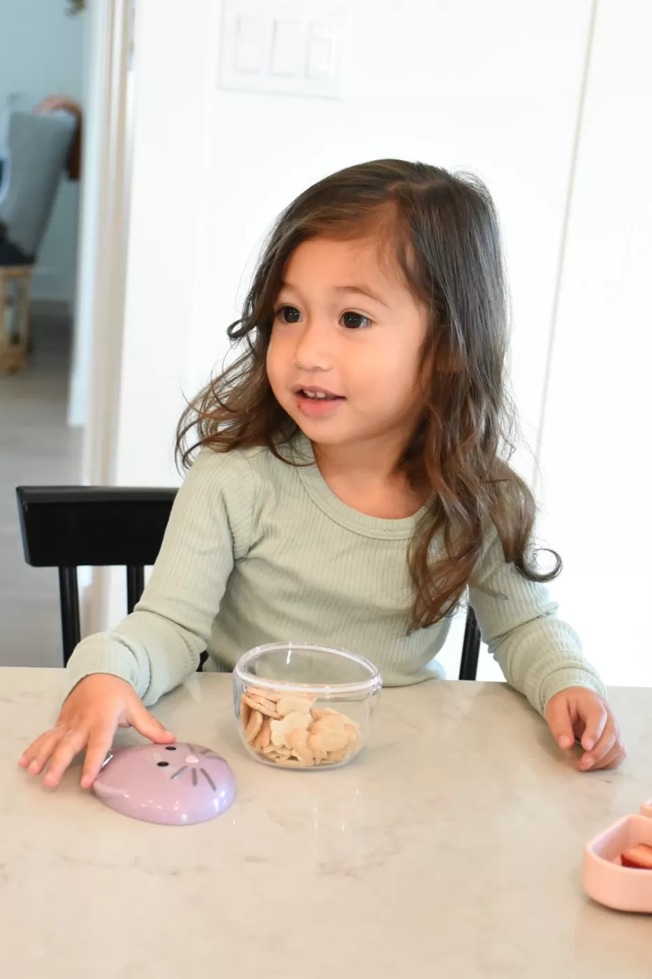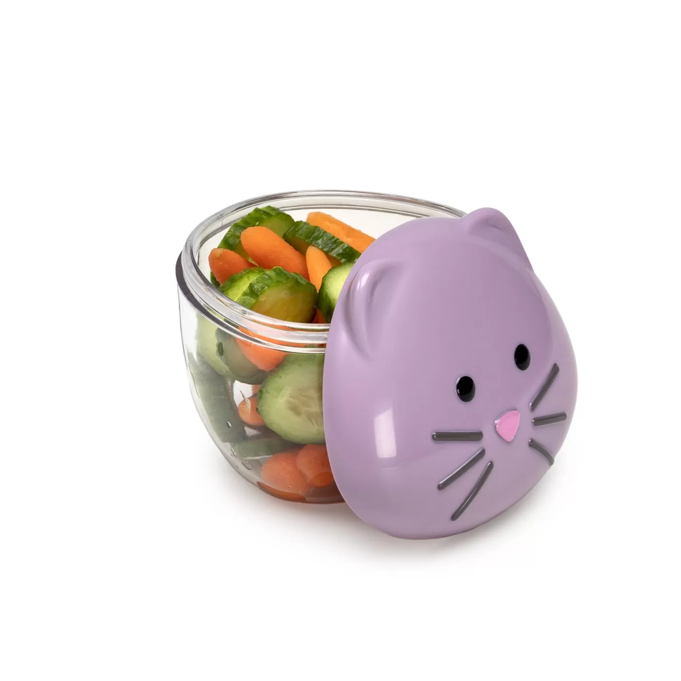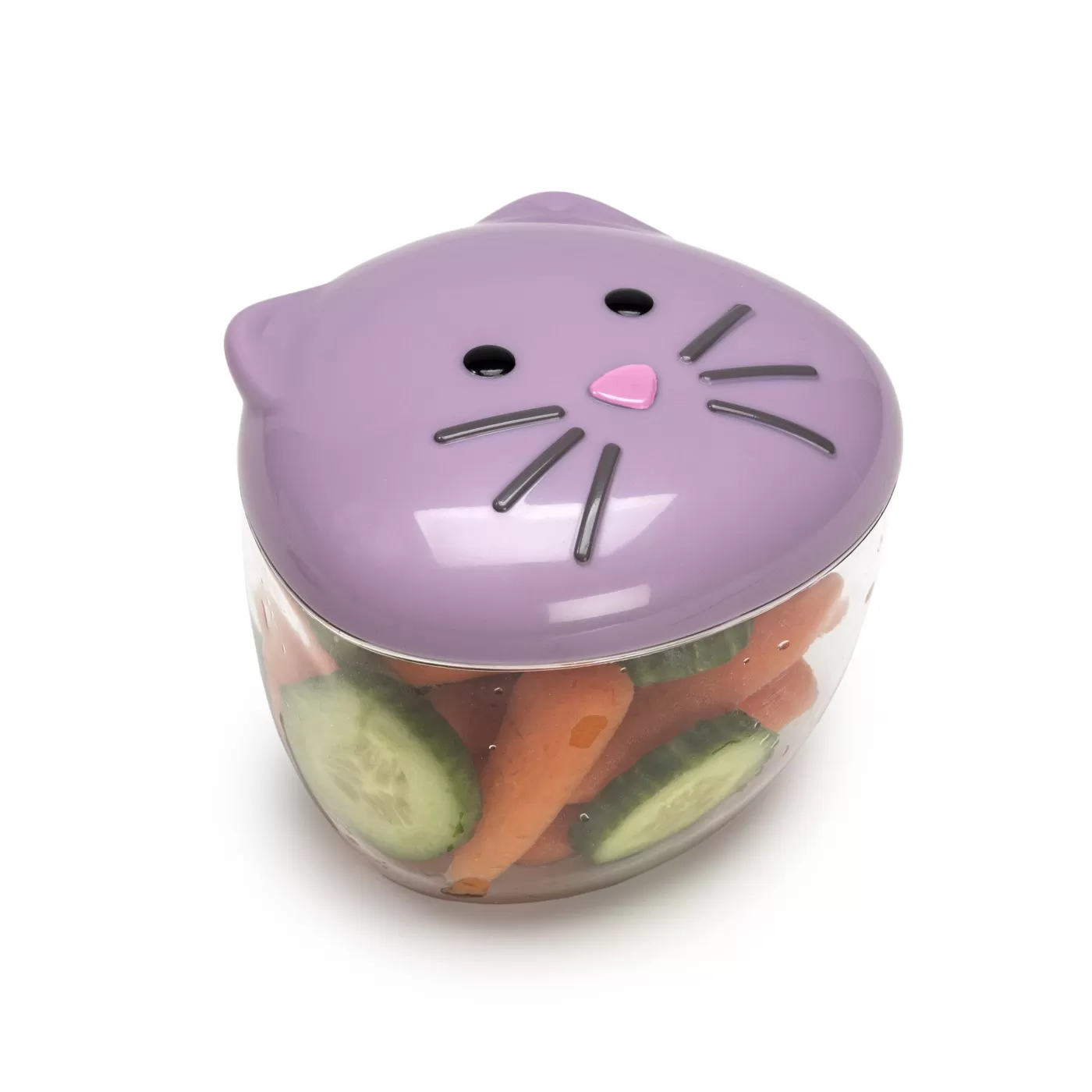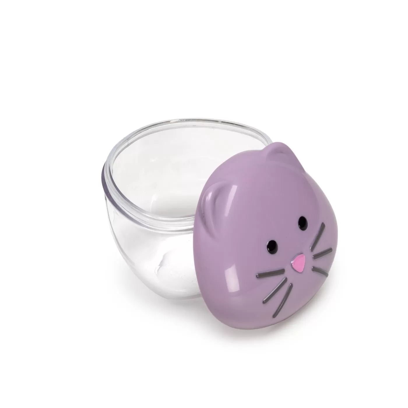 Acest recipient de mancare cu capac pisica, de dimensiuni potrivite pentru copii, face gustarile distractive si are, in acelasi timp, un capac ermetic si antipicurare pentru a preveni mizeriile.