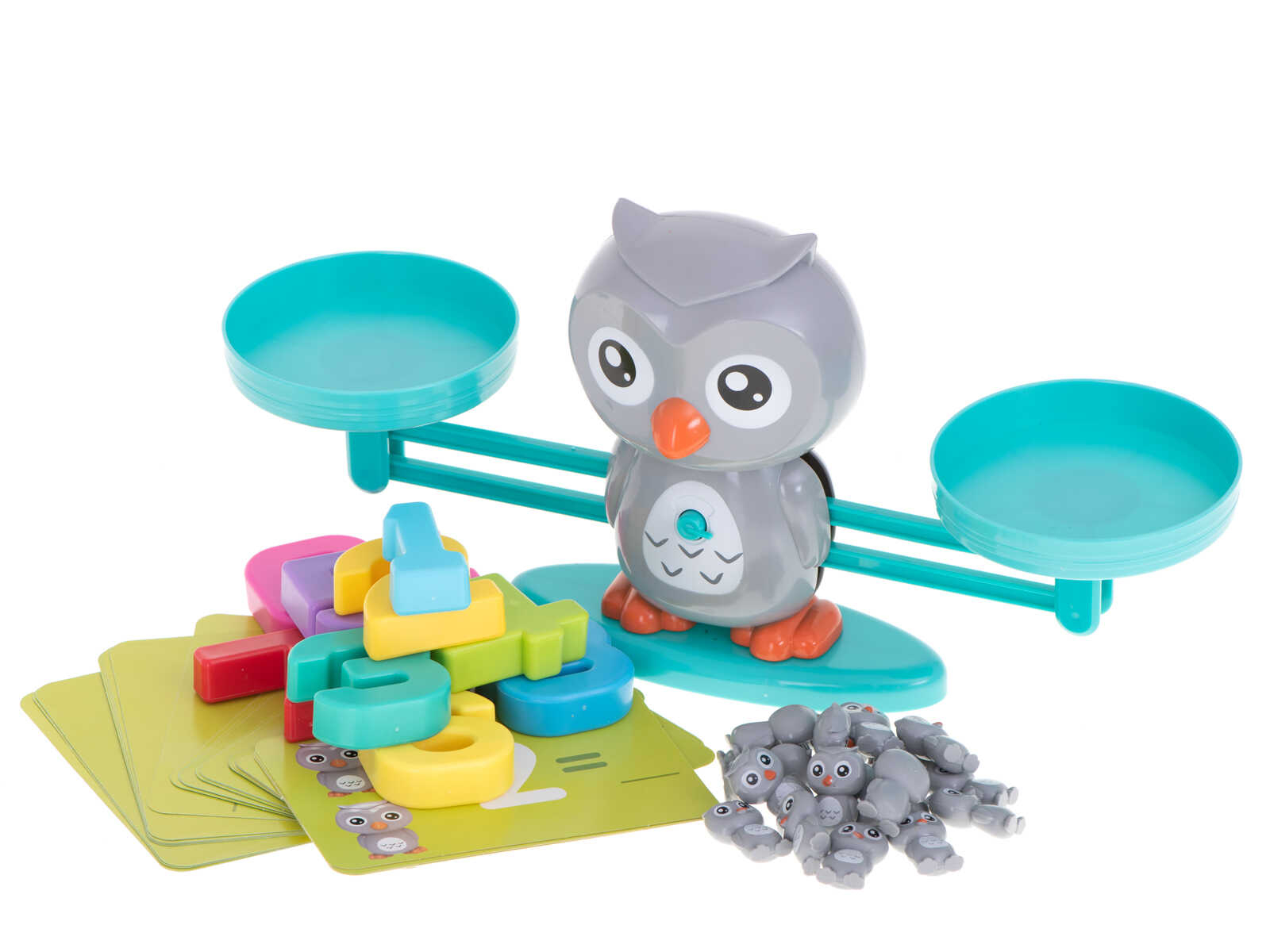 copilul plaseaza o cifra pe un brat al balantei si incearca sa o potriveasca cu numarul corect de bufnite pe partea cealalta