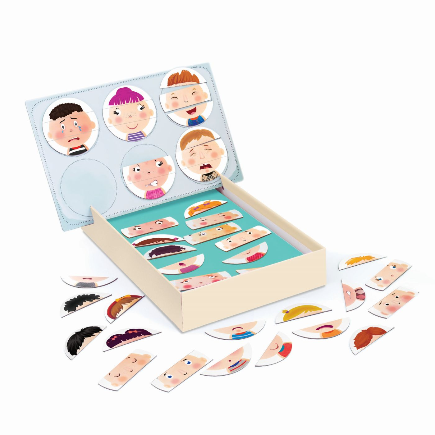 Un joc educativ de invatare emotionala cu 42 de magneti de hartie. Setul ii familiarizeaza pe copii cu invatarea emotionala, ajutandu-i sa recunoasca mai intai diferitele expresii faciale si apoi, cu ajutorul ghidului ilustrat, sa invete cum se reflecta emotiile umane in expresiile lor. Fiecare magnet descrie trasaturi diferite pentru a reflecta expresii si emotii variate. Cum arata cineva cand este fericit, trist sau suparat? Cum se manifesta sentimentele de gelozie, rusine, iubire sau suferinta?