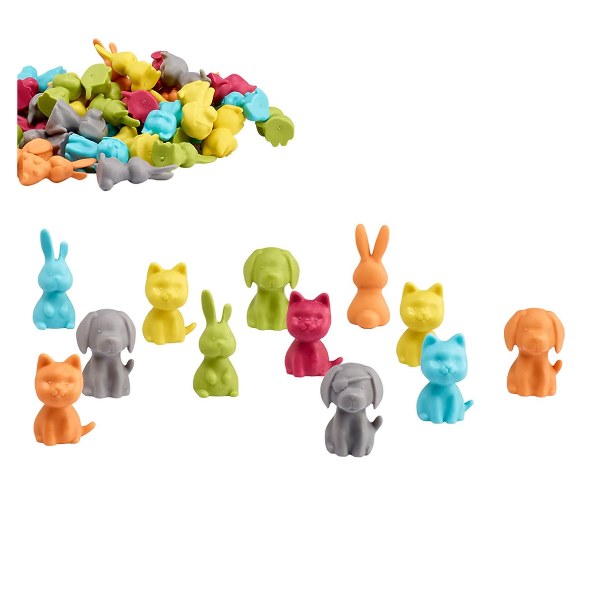 - Fiecare set contine: 2 iepuri, 2 caini si 2 pisici – dintre care unul din fiecare pereche are o imperfecțiune vizibila, pentru a incuraja discutiile despre diversitate si acceptare.