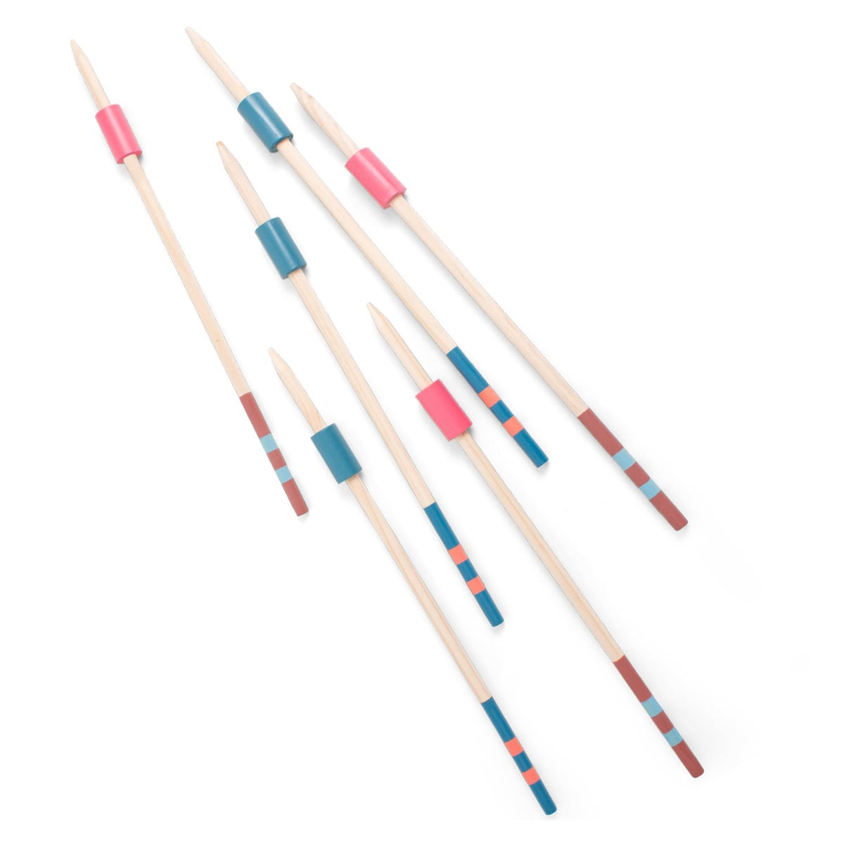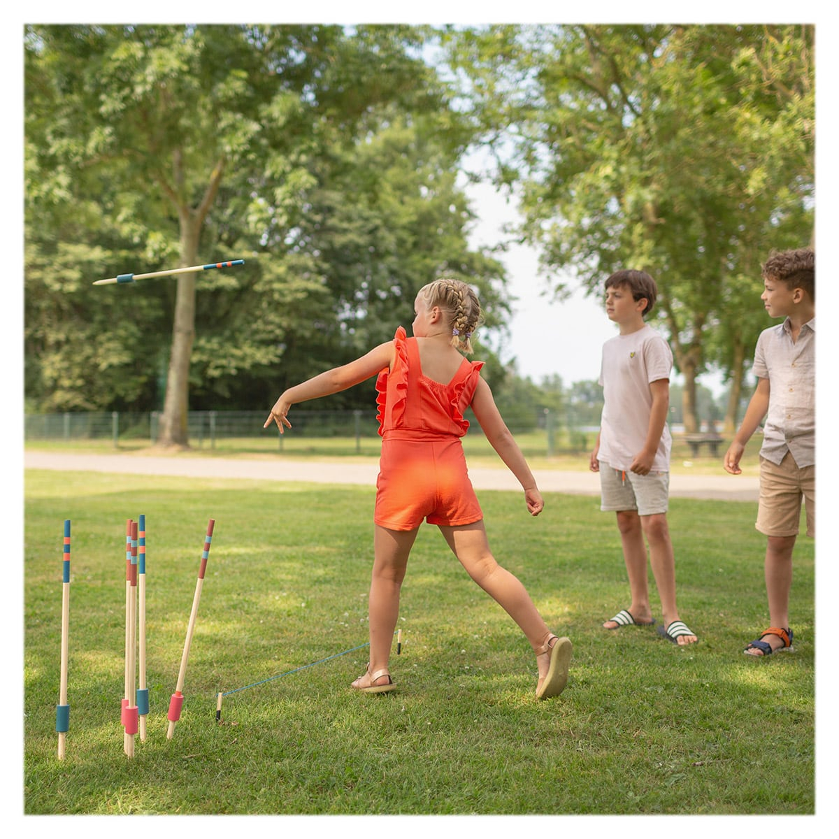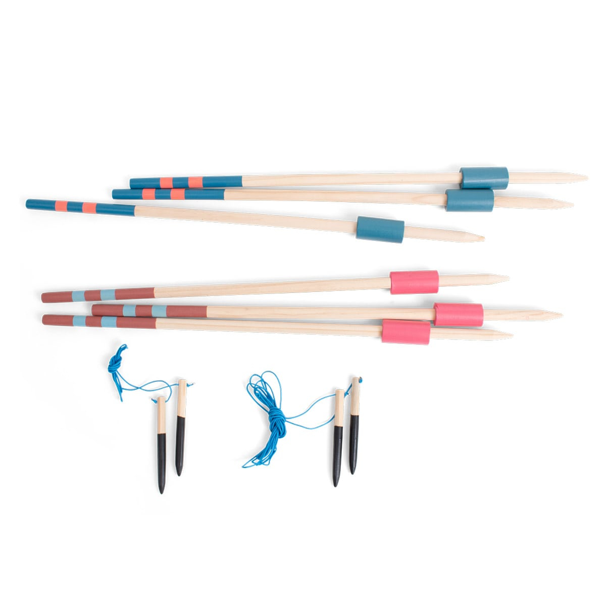 • Jocul contine: 6 sulite din lemn (2 seturi) cu lungimea de 60 cm, marcaj pentru start si finish (din franghie).