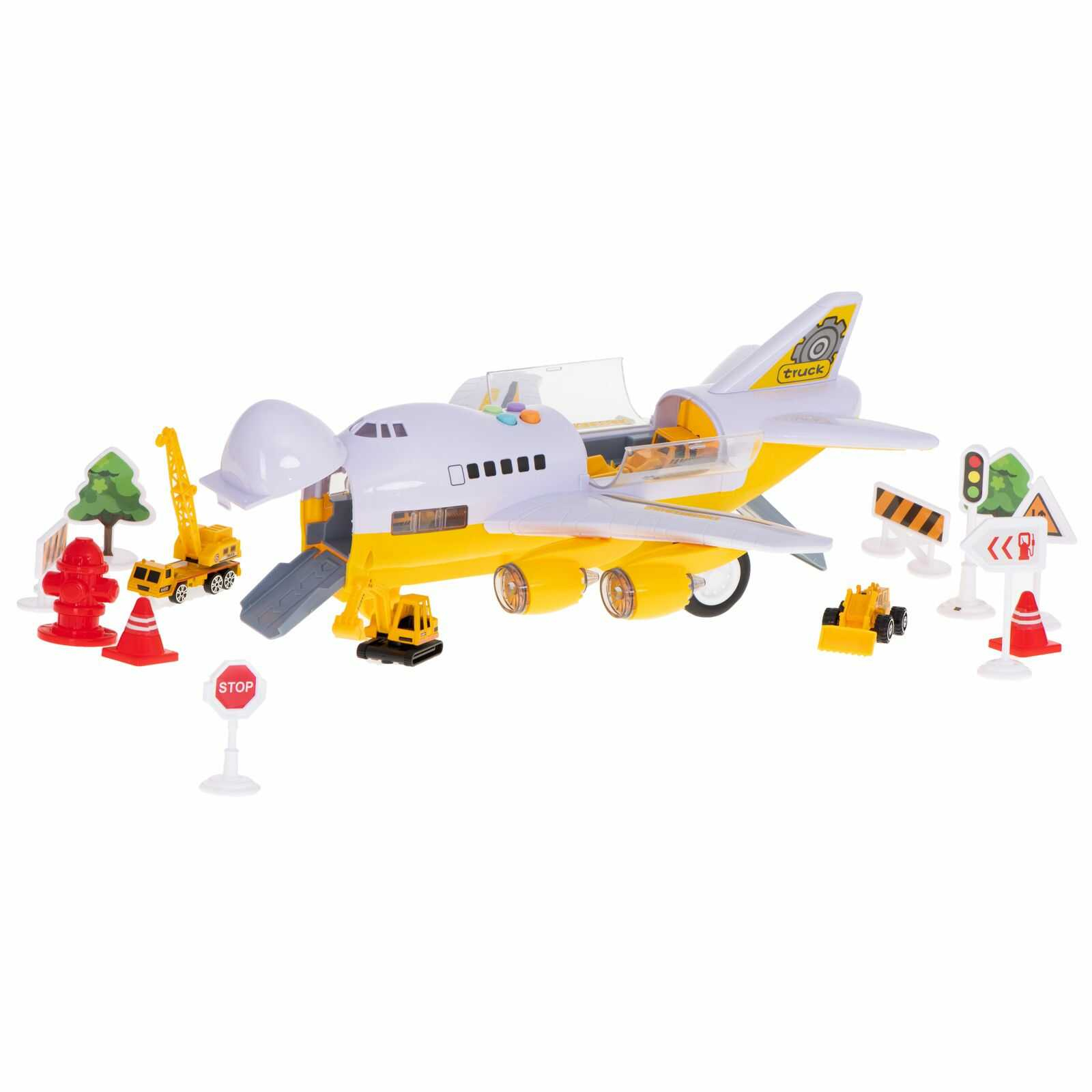 Avionul transport cu vehicule de constructii este o jucarie complexa si captivanta, care combina doua pasiuni indragite de copii: avioanele si masinile de santier.