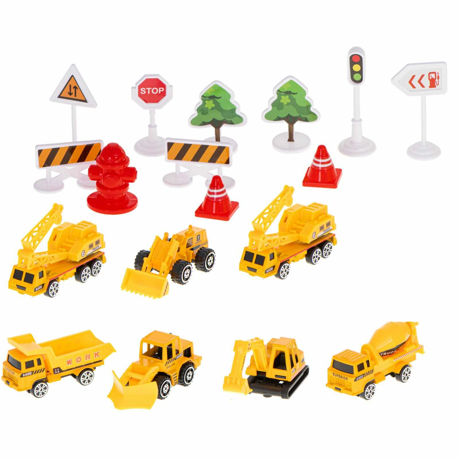 Setul include 6 vehicule de constructii diferite, fiecare cu detalii specifice, alaturi de accesorii precum copaci si conuri, care ajuta la construirea unor scenarii variate.