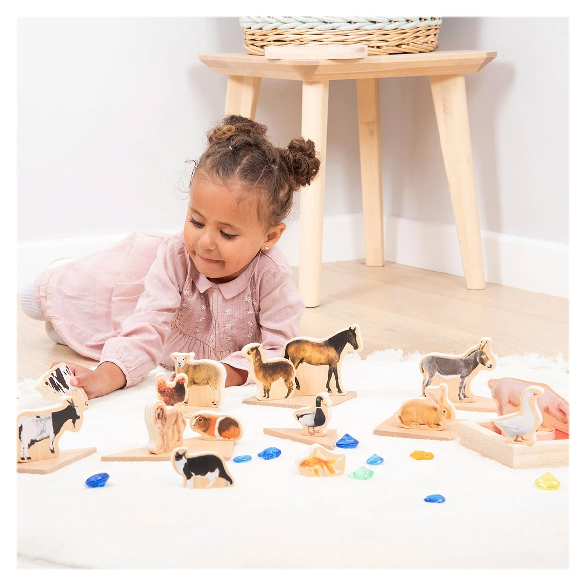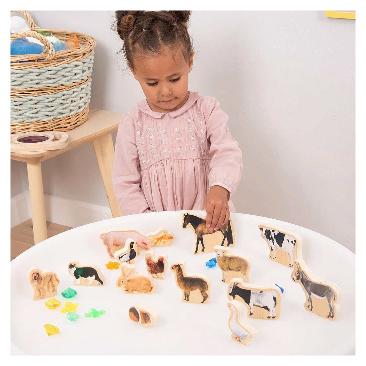 • Descopera animalele de la ferma cu acest set de blocuri din lemn imprimate cu imagini realistice!