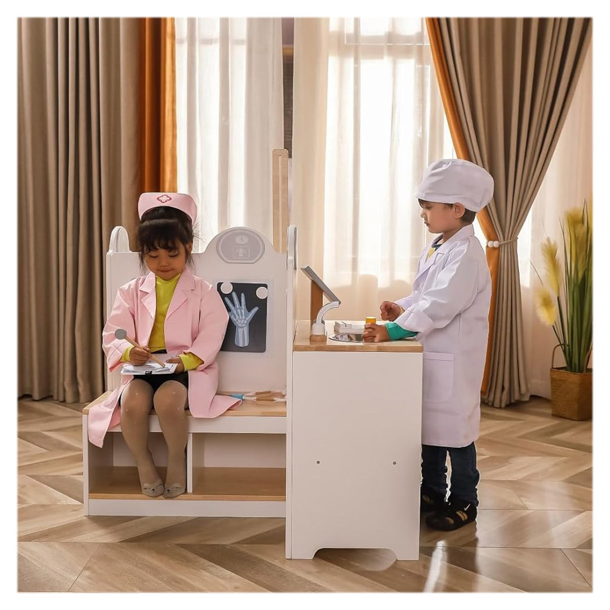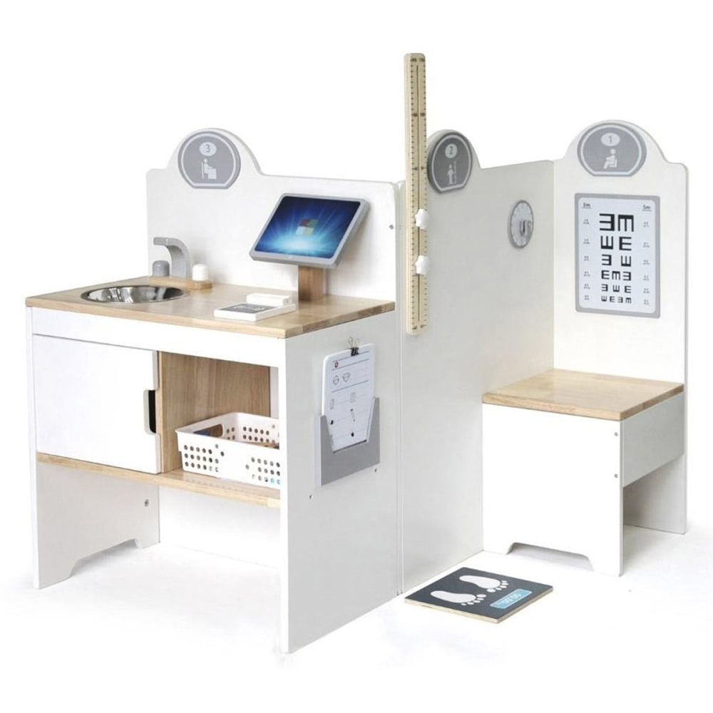 - Acest cabinet medical este perfect pentru a ajuta copiii sa inteleaga si sa se familiarizeze cu mediul medical si cu instrumentele folosite intr-o clinica, reducand temerile legate de vizitele la doctor si oferind o perspectiva pozitiva asupra ingrijirii medicale.