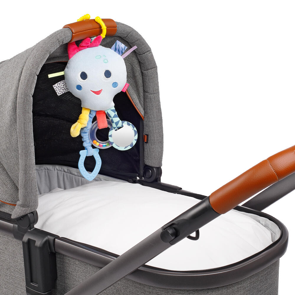 - Elemente interactive: jucaria este prevazuta cu oglinda, zornaitoare, jucarie pentru dentitie, pentru a captiva interesul si atentia bebelusului