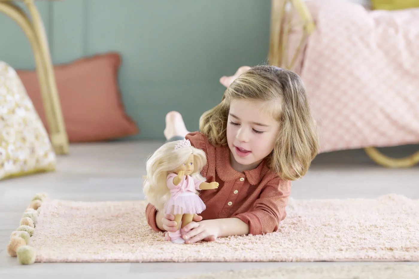 Set cadou tip cutie, format dintr-o papusa mica de 20 cm, gata de oferit cadou, si 3 accesorii. Rosy, o papusa mica cu pielea deschisa la culoare, are un corp din vinil moale la atingere, cu un parfum delicat de vanilie. Ochii ei albastri sunt pictati pe fata. Are parul blond, lung si matasos, usor de coafat. Este imbracata intr-o tinuta eleganta de dans all-in-one, format dintr-un tricou, un jupon frumos din tul roz si o pereche de pantofi albi mulati. De asemenea, vine cu o vesta roz mica asortata cu tinuta, o pereche de jambiere si o tiara.