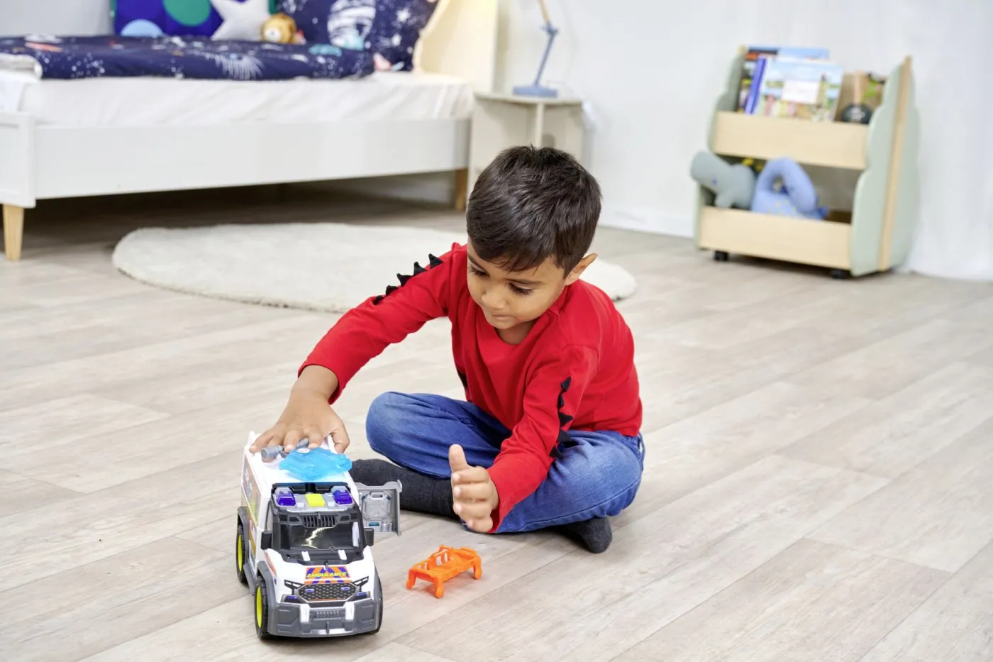 Ambulanta mare cu functie de tragere si accesorii, pentru copii cu varsta peste 3 ani, cu lumina si sunet. Dispozitivul de tragere de pe acoperisul masinii de jucarie este folosit pentru a lansa discurile albastre incluse, care au gravuri grozave care infatiseaza apa si drone. Furgoneta paramedicilor are un compartiment lateral si o usa din spate care poate fi pliata pentru a forma o rampa pentru incarcarea si descarcarea comoda a targii furnizate. Masina de salvare se indreapta spre medicul de urgenta cu lumina albastra si sirena si este sustinuta de zgomotele de pornire a motorului si de conducere.