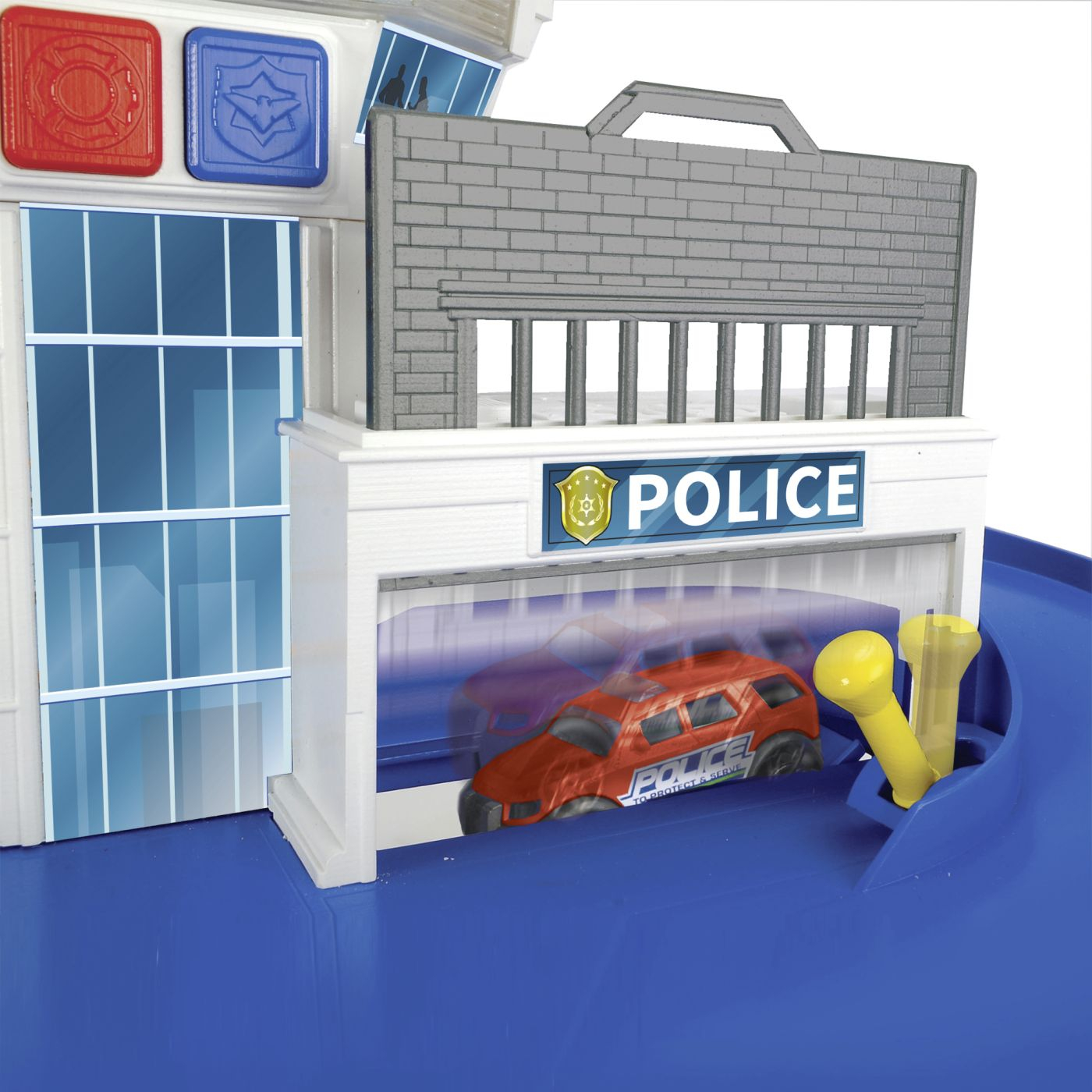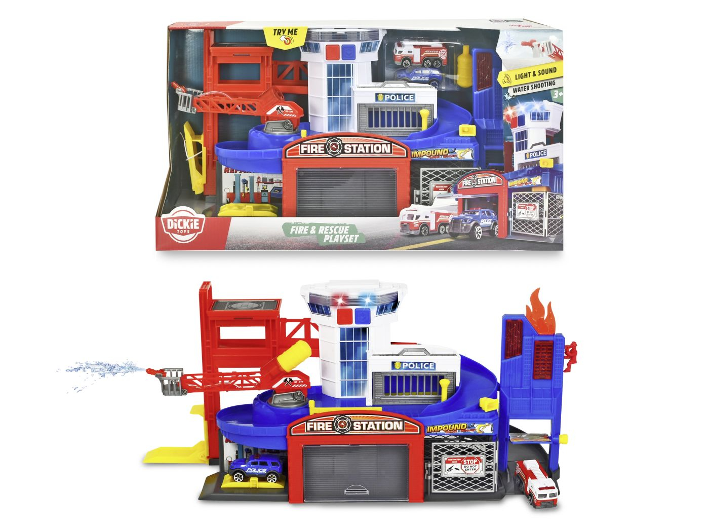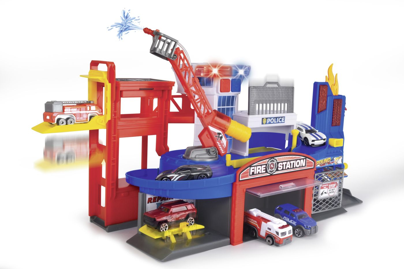 Statia de pompieri si salvare este setul perfect pentru micii eroi pregatiti de actiune! Avand dimensiunile de 50 x 17,5 x 24 cm (LxlxI), aceasta include o sectie de pompieri si politie, o rampa dinamica si un lift manual, transformand joaca intr-o experienta realista si captivanta. Setul contine doua vehicule o masina de pompieri si un vehicul de politie, dar este compatibil si cu alte masinute de jucarie de la branduri cunoscute. Efectele luminoase si sonore cu sirena si lumina albastra de pe turnul de control sporesc atmosfera de urgenta si distractie. Apasa butonul, porneste sirena si lanseaza masinile pe rampa direct in misiune! In plus, statia este dotata cu o scara rotativa cu functie de pulverizare cu apa, pentru un plus de realism in jocurile de salvare. Include 2 baterii AA si este recomandata copiilor de la 3 ani in sus.