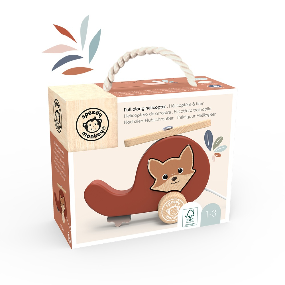 Elicopter de tras din lemnSpeedy Monkey Porneste la drum alaturi de micutul Elicopter de tras , o jucarie care imbina miscarea si imaginatia! Stimuleaza mersul, dezvoltarea motrica si jocul independent. Cu un design vesel si roti care se invart usor, elicopterul adauga entuziasm fiecarui pas. Este potrivit pentru mainile si pasii micilor exploratori. Caracteristici: Insotitor pentru primii pasi, exerseaza coordonarea si echilibrul Culori vii si roti mobilestimuleaza atentia si miscarea Usor de intretinut - se curata cu o laveta umeda Recomandat pentru c opii peste 1 an. Lungime snur: 59 cm 🌱 Realizat din lemn certificat FSC® AVERTISMENT: Contraindicat copiilor sub 1 an. Contine snur lung. Pericol de strangulare. Se recomanda supravegherea copilului in timpul jocului. Producator: Speedy Monkey
