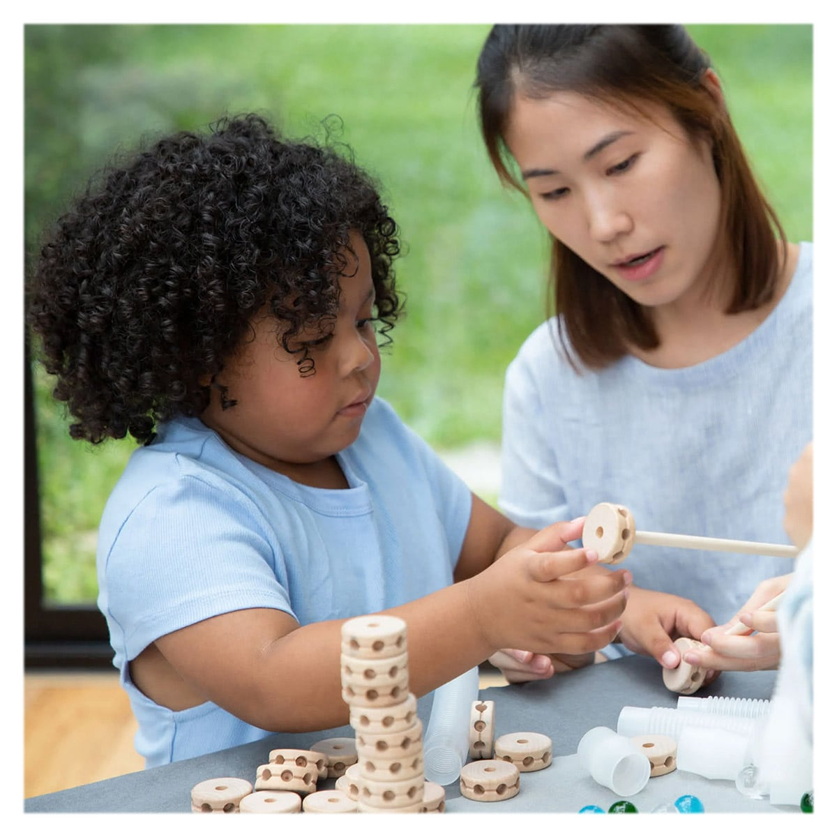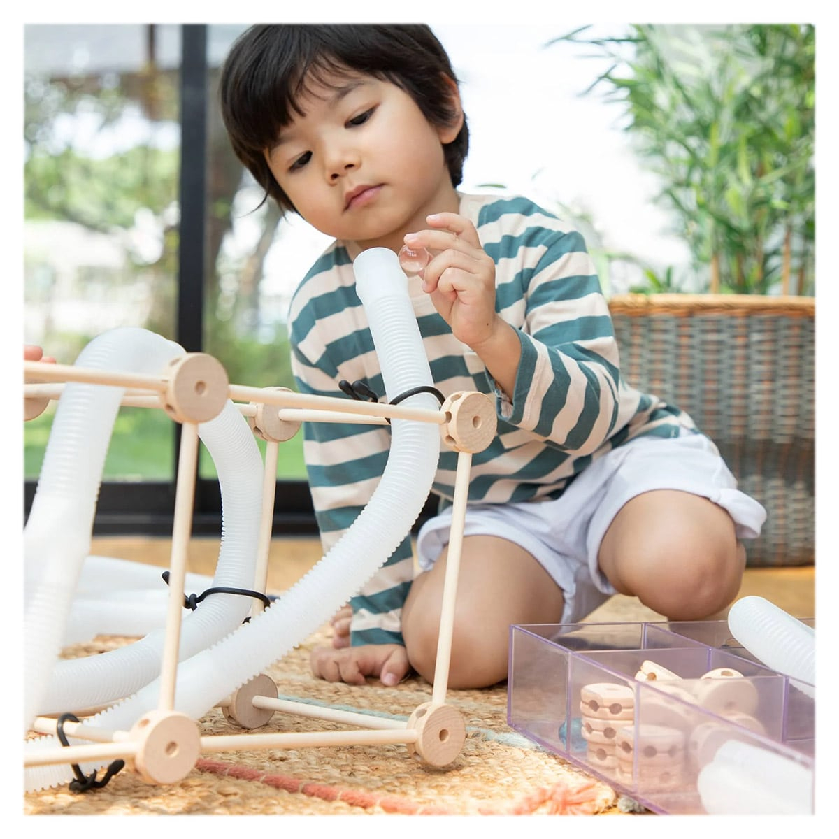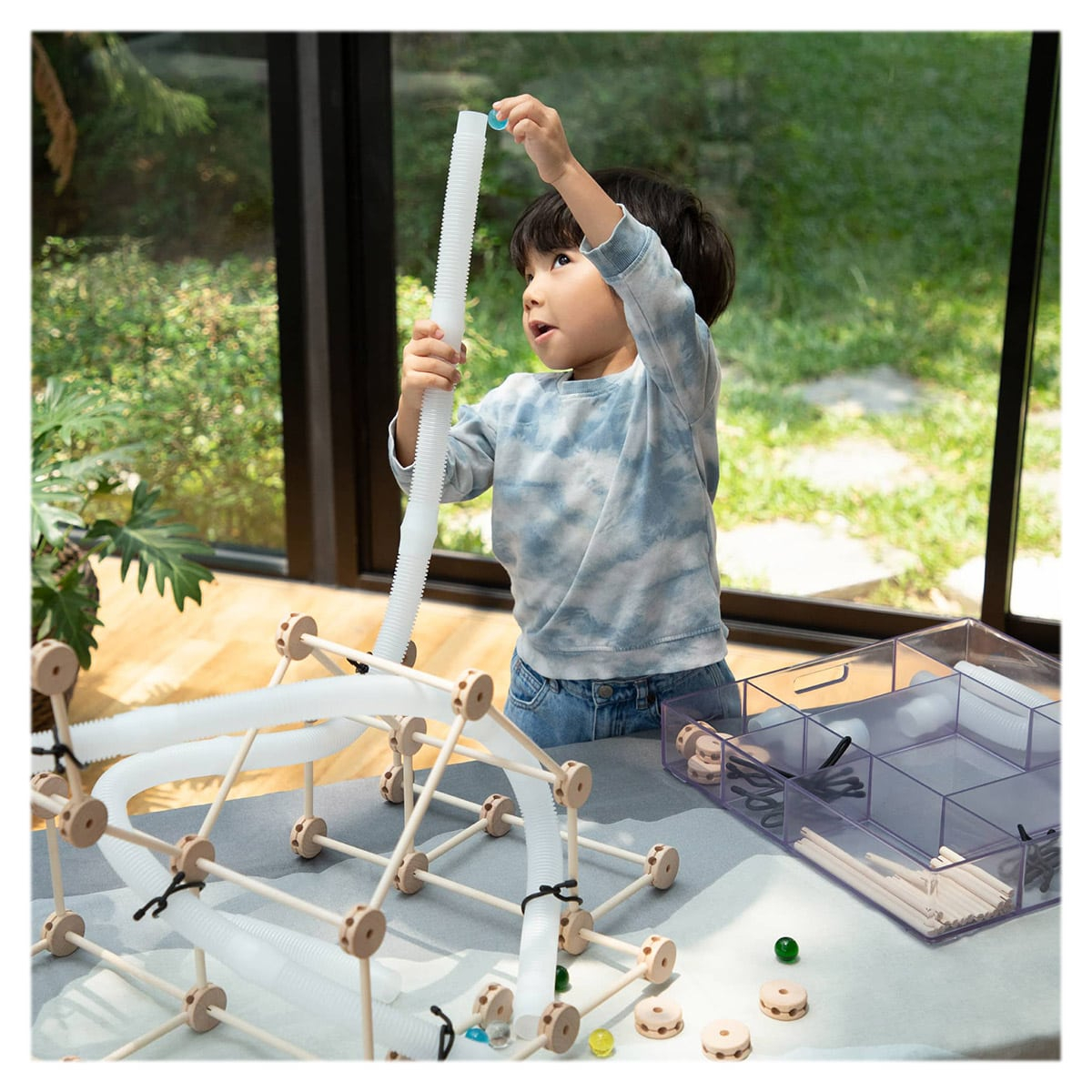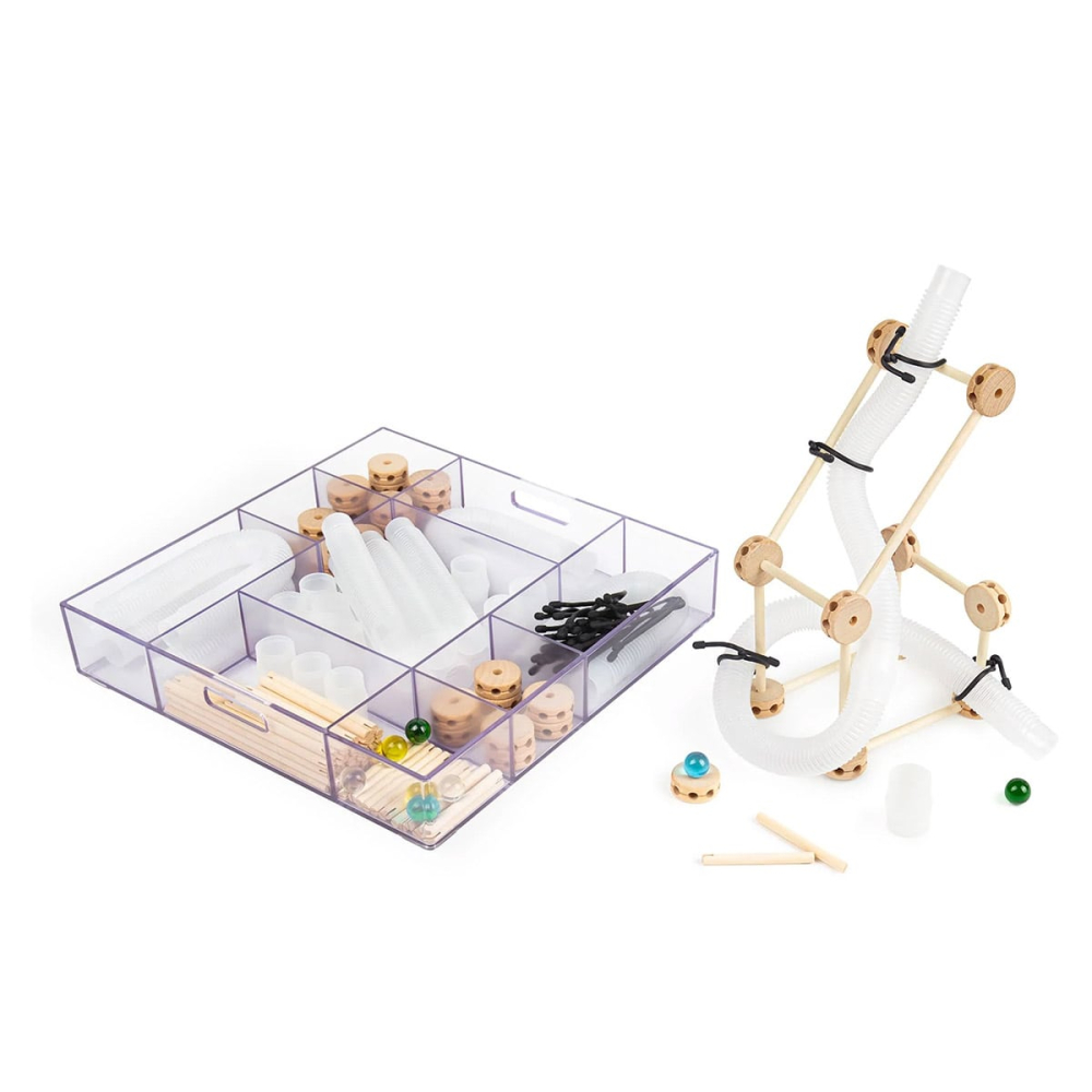 • Copiii pot explora concepte precum inclinatia, frecarea si viteza in timp ce construiesc trasee si structuri, folosind cele 155 de piese incluse: conectori si tije din lemn, tuburi ondulate, piese din plastic si legaturi tip “gear twist”.