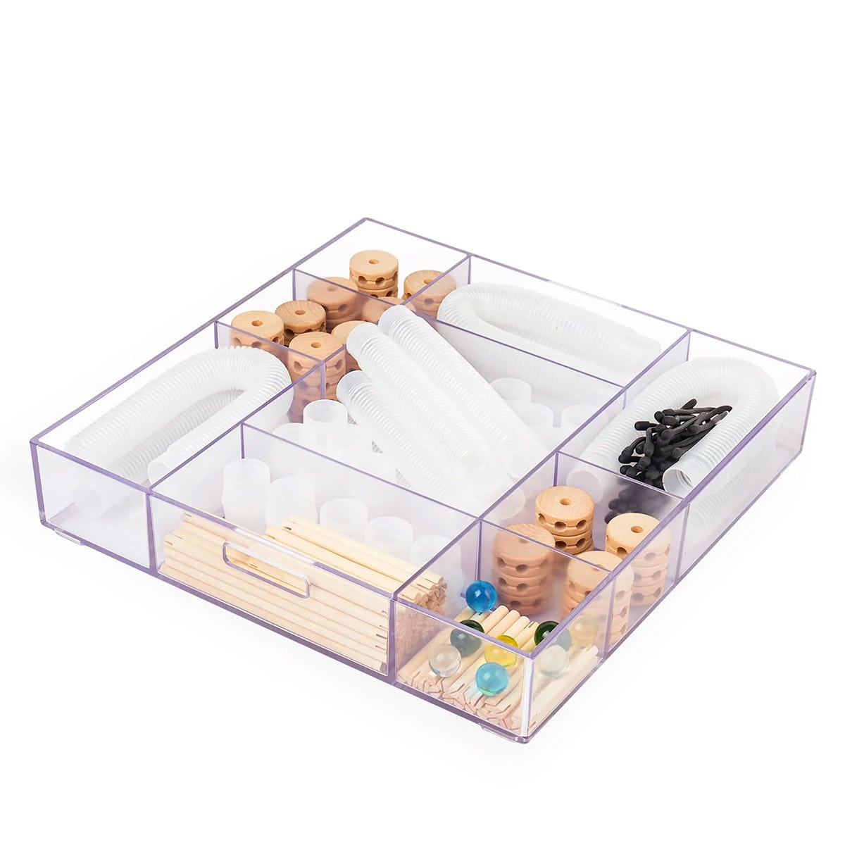 • Setul include 155 de piese variate: conectori si tije din lemn, tuburi ondulate, elemente din plastic si bile acrilice colorate, tava din plastic compartimentata pentru depozitare (dimensiuni: 32 x 32 x 7 cm).