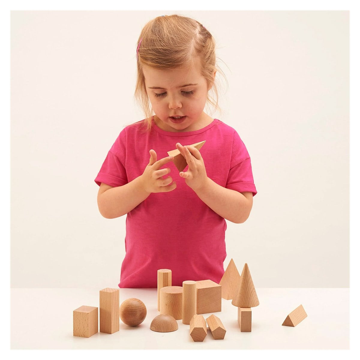 • Acest set de 15 forme geometrice din lemn natural este perfect pentru ca cei mici sa exploreze concepte precum suprafata, volumul, dimensiunile si unghiurile intr-un mod tactil si vizual.