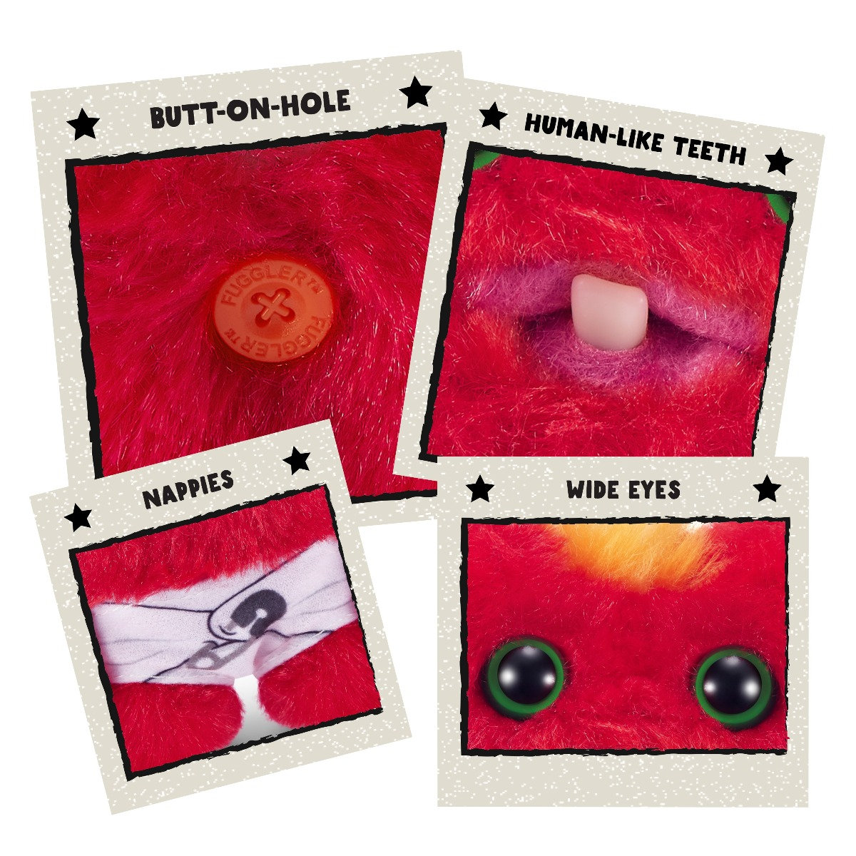 Faceti cunostinta cu Baby Fuggs, micii nazdravani de doar 9 cm, care tocmai au venit pe lume si sunt gata sa faca numai trasnai! Nu va lasati pacaliti de infatisarea lor adorabila – in spatele acestor mutrisoare dragalase se ascund adevarati strengari. Cu ochi mari si inocenti, cativa dintisori sclipind siret si smocuri de par razlete, Baby Fuggs poarta scutece care nu reusesc deloc sa le opreasca micile accidente . Atentie! Desi par simpatici, acesti micuti nazdravani sunt la fel de sireti ca versiunea lor adulta – daca nu chiar mai rai!