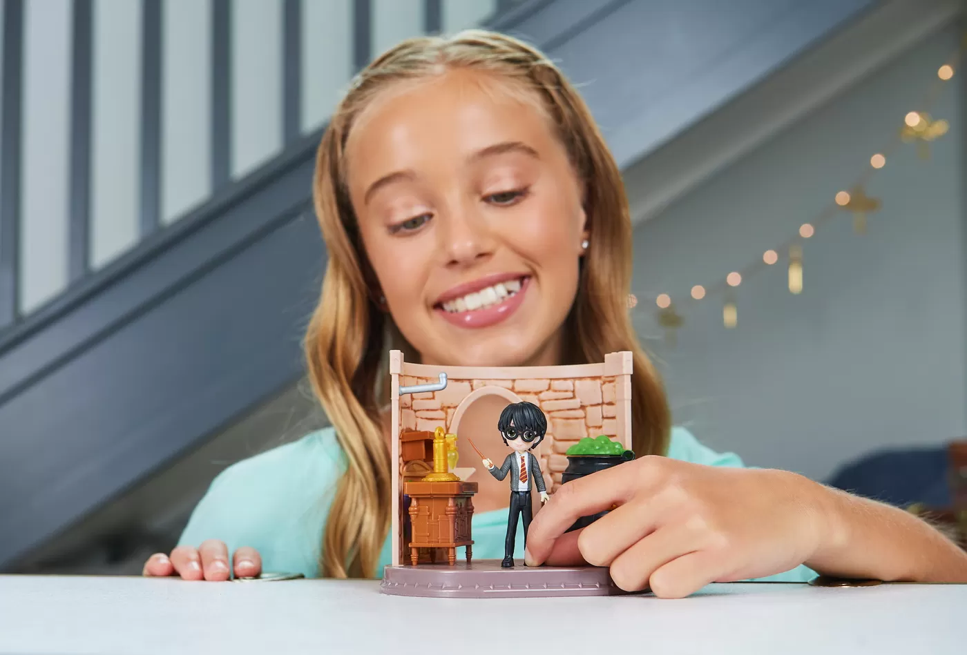 Pozitionati figurina Magical Minis si aprindeti flacarile cazanului mutandu-l pe Harry peste locul de activare - flacarile se ridica si ceaunul se deschide magic! Sala de Potiuni are chiar si un biban pentru Hedwig (nu este inclus) pentru a va observa aventurile fermecatoare.