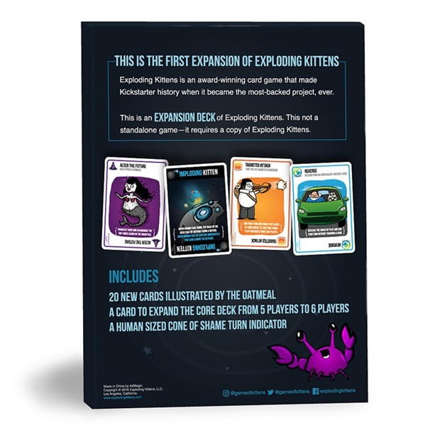 Imploding Kittens este prima extensie a jocului Exploding Kittens, jocul de carti super-premiat care a facut istorie pe Kickstarter, fiind cel mai sustinut proiect din platforma. Aceasta extensie include 20 de carti cu 6 tipuri noi de actiuni si o Pisicuta care face implozie, jocul putand creste astfel de la 5 la 6 jucatori.